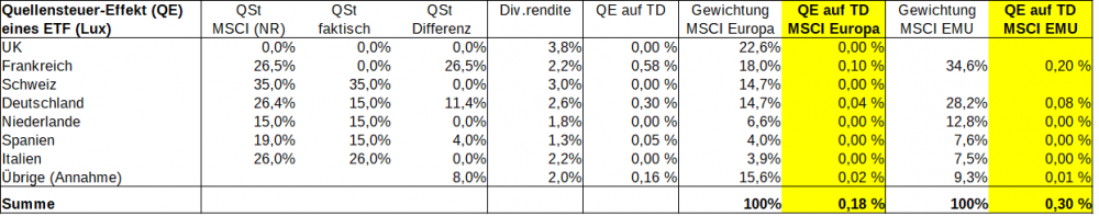 Ich habe die Sache mal näher angeschaut und komme zu dem Ergebnis, dass der Quellensteuereffekt beim MSCI EMU derzeit ca. 0,30% und beim MSCI Europa ca. 0,18% ausmacht. Mit anderen Worten kann die Quellensteuer einen Unterschied der Tracking Difference zwischen physisch replizierenden ETF mit Domizil Luxemburg auf die beiden NR-Indizes in Höhe von ca. 0,12% erklären.