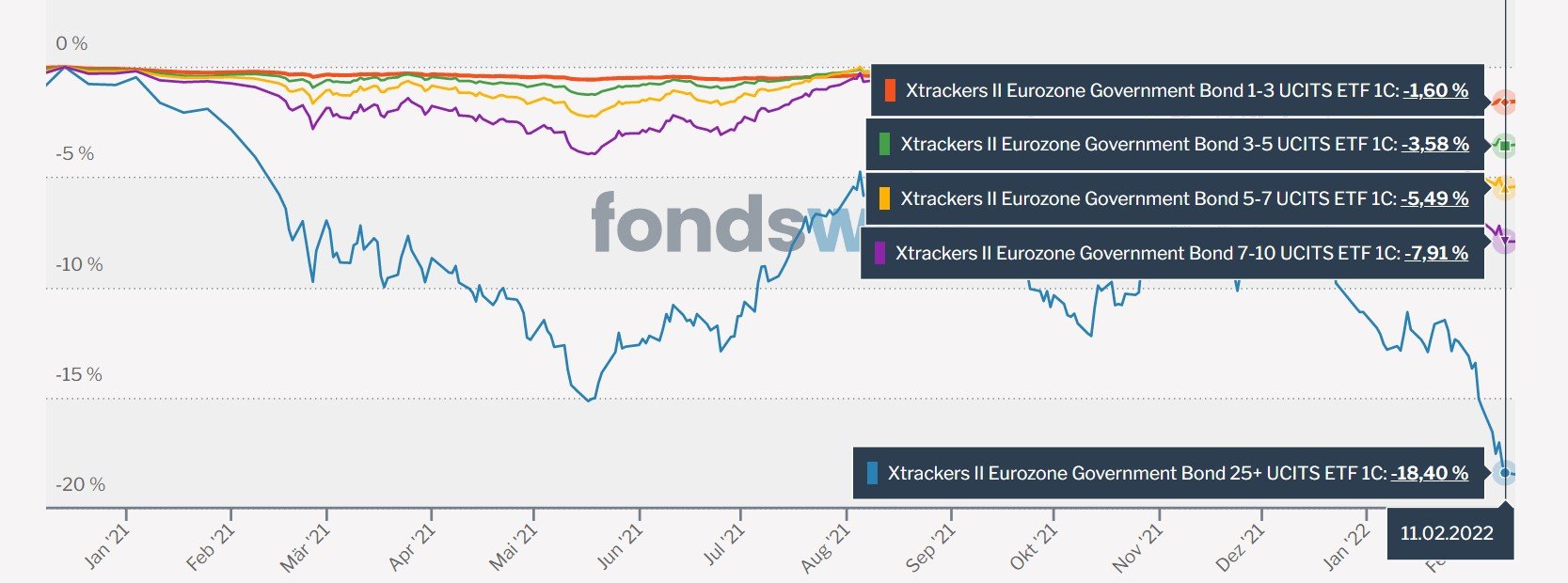 Wenn ich sehe, dass ein Vanguard Glob. Agg. Bond EUR mittlerweile ca. 7% unter seinem ATH läuft und ein Eurozone Gov. Bond Langläufer ETF mittlerweile ca. 20% (und beide damit massiv an Kurs verloren haben), dann könnte (!!) man auch langsam wieder so denken: