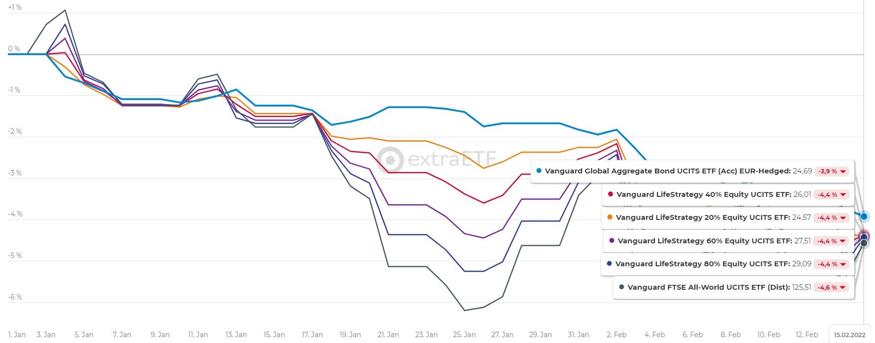 Hab gerade mal nachgesehen, ich bin YTD bei +1,1%,, die Diversifikation hat erstaunlich gut funktioniert. Mein Rentenanteil beträgt übrigens 3% .... und das sind Transocean Anleihen, also alles andere als eine sichere Anlage. ;)  Bis letztes Jahr hatte ich noch einen EM-Bond ETF, aber den habe ich zum Glück verkauft. Bis auf weiteres sind Anleihen (und somit auch Mischfonds) für mich kein Thema.