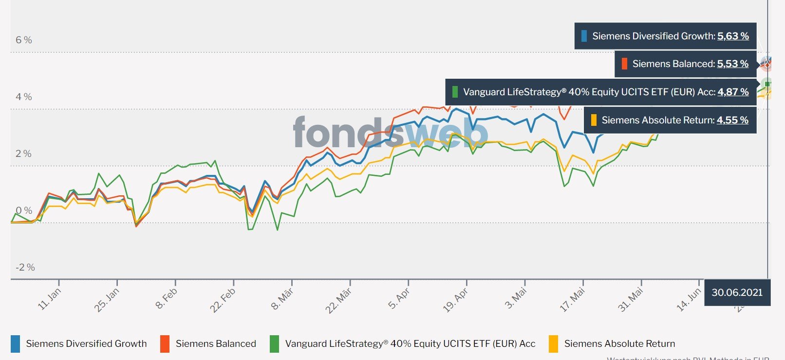 Madame_Q Juli 3, 2021 · bearbeitet Juli 3, 2021 von Madame_Q Kleiner Zwischenbericht bei den Siemens-Fonds: Der defensive Diversified Growth hat es nun tatsächlich geschafft, den offensiveren Balanced zu überholen seit Jahresbeginn: https://www.fondsweb.com/de/vergleichen/tabelle/isins/DE000A14XPF5,DE000A0KEXM6,IE00BMVB5M21,DE000A2N66L7 (als Referenz habe ich wie so oft noch den dazu passenden Vanguard beigefügt). Erstaunlich ist dies deshalb, weil es in einer steigenden Marktphase passiert ist. Dass ein defensiveres Produkt in fallenden oder auch seitwärts laufenden Märkten punkten kann im Vergleich zum offensiven Produkt, ist keine Kunst, aber anders herum ist das schon einen Post wert finde ich. Ich bin gespannt, ob der D.G. das halten kann. Meine Vermutung, dass das größere Anleihen- und auch Aktien-Spektrum im Vergleich zum Balanced ein Vorteil ist, scheint aufzugehen. Der Balanced "darf" aufgrund seines Vergleichs-Benchmarks ja nur Euro-Unternehmensanleihen und nur US- u. EMU-Aktien halten. Diese eingeschränkte Flexibilität ist aktuell ein Problem für ihn. Zur Erinnerung meine Risiko-Einschätzung beider Produkte im Vergleich: - Balanced ca. 50% Risiko eines 100%-Aktien-Welt-ETF - Diversified Growth ca. 35% Risiko eines 100%-Aktien-Welt-ETF Max. DDs Corona Crash: - Balanced: ca. 17,5% - D.G.: ca. 11,5% Diesen Beitrag teilen Link zum Beitrag