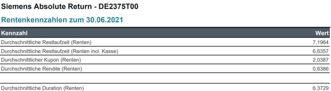 Madame_Q Juli 18, 2021 · bearbeitet Oktober 9, 2021 von Madame_Q Hier mal die aktuellsten Daten zum Siemens Absolute Return: Die laufenden Gesamtkosten des Fonds betragen ca. 0,45%. Die aktuelle effektive Rendite des Rententeils (der übrigens bei ca. 57% liegt) ist also höher als die laufenden Kosten (das betrachte ich immer als absolute Grundvoraussetzung, damit der Fonds überhaupt in Frage kommt als Investition). Und bitte nicht täuschen lassen. Der Fonds tauscht gut gelaufen Anleihen (Kursgewinne etc) regelmäßig aus. Man kann hier also nicht einfach nur rechnen: 0,64% Anleihenrendite minus 0,45% laufende Kosten = 0,19% Rendite beim Rententeil. Wäre das so, würde ich den Deal nicht eingehen, weil der Ertrag des Anleihenteils nicht im Verhältnis zum Risiko steht. Die Aktienquote beträgt aktuell ca. 38%. Der Fonds sichert aber über Derivate entsprechend ab, um das Risiko unter Kontrolle zu halten. Natürlich muss man ein gewisses Mindestvertrauen in die doch aktiven Entscheidungen der Herren bei Siemens haben. Der große Unterschied zu anderen, aktiven Mischfonds sind aber die deutlich geringeren, laufenden Kosten. Das ist fast konkurrenzlos im Bereich aktive Mischfonds. Wie hier schon erwähnt halte ich den Diversified Growth für effektiver, weil er etwas "freier atmen" kann wie der Absolute Return, aber wer die oberste Priorität auf Sicherheit legt und wenig Schwankung, könnte beim Absolute Return vielleicht richtig liegen (deine Frau z.B.). Wie schon mehrmals erwähnt, würde ich ihn ohne zu Zögern einem Vanguard LS20 vorziehen (allein schon, weil hier die Teilfreistellung von 15% eingehalten wird). Diesen Beitrag teilen Link zum Beitrag