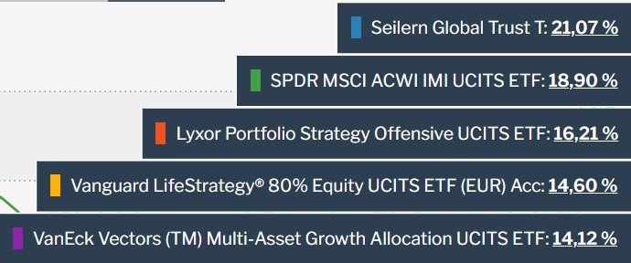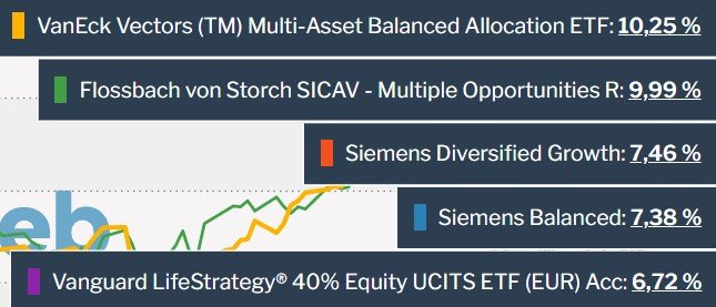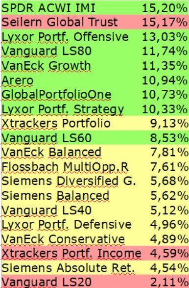 Madame_Q August 6, 2021 · bearbeitet August 6, 2021 von Madame_Q Als Zusatz führe ich noch die effektive Performance nach Abzug der Steuern an, die je nach Teilfreistellung doch nicht ganz unbedeutend Einfluss auf das hat, was dann letztendlich bei uns allen in der Tasche landet. Ich ziehe hier die höchstmögliche Abgeltungssteuer inkl. 9% Kirchensteuer heran ,also den "teuersten" Steuerfall (27,9951% insgesamt => ich rechne mit runden 28%). Ich markiere zudem jeden Fonds farbig nach entsprechender Teilfreistellung (grün=30%, gelb=15%, rot=0%). Die aktuelle Performance-Liste mit den Fonds sieht dann so aus (schon ganz oben fällt der Seilern dann auf Platz 2 zurück, weil er keinerlei Teilfreistellung hat und der SPDR eben volle 30%): Diesen Beitrag teilen Link zum Beitrag