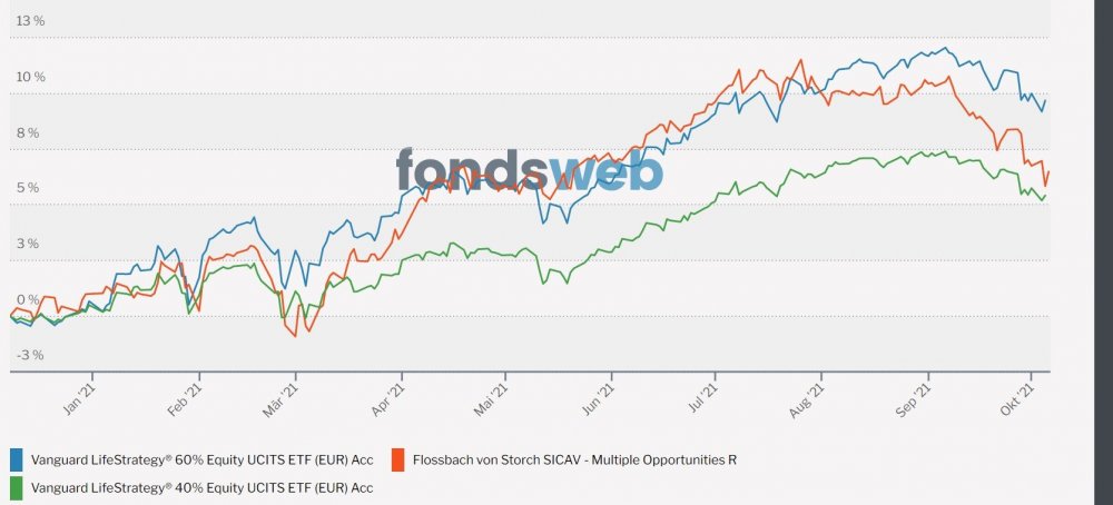 Madame_Q Oktober 7, 2021 · bearbeitet Oktober 9, 2021 von Madame_Q Ich musste aus bestimmten Gründen eine längere Pause einlegen. Andererseits ist es vielleicht sogar besser, wenn es nicht jeden Monat ein Update gibt, sondern vielleicht nur alle drei Monate bzw. womöglich poste ich nur noch, wenn es Auffälligkeiten gibt oder spezielle Kandidaten "aus der Reihe tanzen" / sich besonders gut oder schlecht entwickeln. Ich liste heute auch nicht alle Fonds auf, möchte aber kurz einige Auffälligkeiten anmerken, die mir aufgefallen sind. Der Seilern Global Trust Mischfonds, welcher ja sogar den 100% Aktien-SPDR-ACWI-IMI übertrumpft hatte, ist Ende September ziemlich eingebrochen und nun "nur noch" auf dem Niveau des Vanguard LS80. Der Grund dürfte die Nike-Aktie sein, die am 23. Sept einen massiven Einbruch hatte und im Seilern eine der größten Positionen war/ist. Hier hat sich sozusagen das Risiko der geringen Diversifizierung (der Seilern hält nur um die 20-25 Aktien) verwirklicht. Rohstoff-Futures liefen das ganze letzte Jahr schon gut, sind aber die letzten Wochen regelrecht explodiert und konnten sich sogar teilweise vom Aktienmarkt abkoppeln (sind gestiegen, wenn die Aktien runter sind, also negative Korrelation). Diese Entwicklung half natürlich Mischfonds mit Rohstoff-Anteil wie dem Arero oder den Lyxor Portfolios, immer noch gut mit aktienlastigeren Konkurrenten wie dem GPO oder dem Vanguard LS80 mithalten zu können. Was insbesondere den Arero etwas bremst, sind die absolut miserabel laufenden Emerging Markets in diesem Jahr (aktuell nur 3% Performance in 2021!). Der Flossbach MO R erfüllt aktuell mehr und mehr genau das, was Gegner von aktiven Fonds immer betonen, nämlich, dass sie nach Entdeckung (aufgrund toller Performance) nicht mehr das halten können, was man sich erhofft. Seit Kurzem kann der Flossbach nicht mal mehr mit dem Vanguard LS60 mithalten und bewegt sich sogar runter auf das Niveau des LS40: IG-EUR-Anleihen bleiben weiterhin ohne Vorteil gegenüber Bankeinlagen mit 0%: Diesen Beitrag teilen Link zum Beitrag