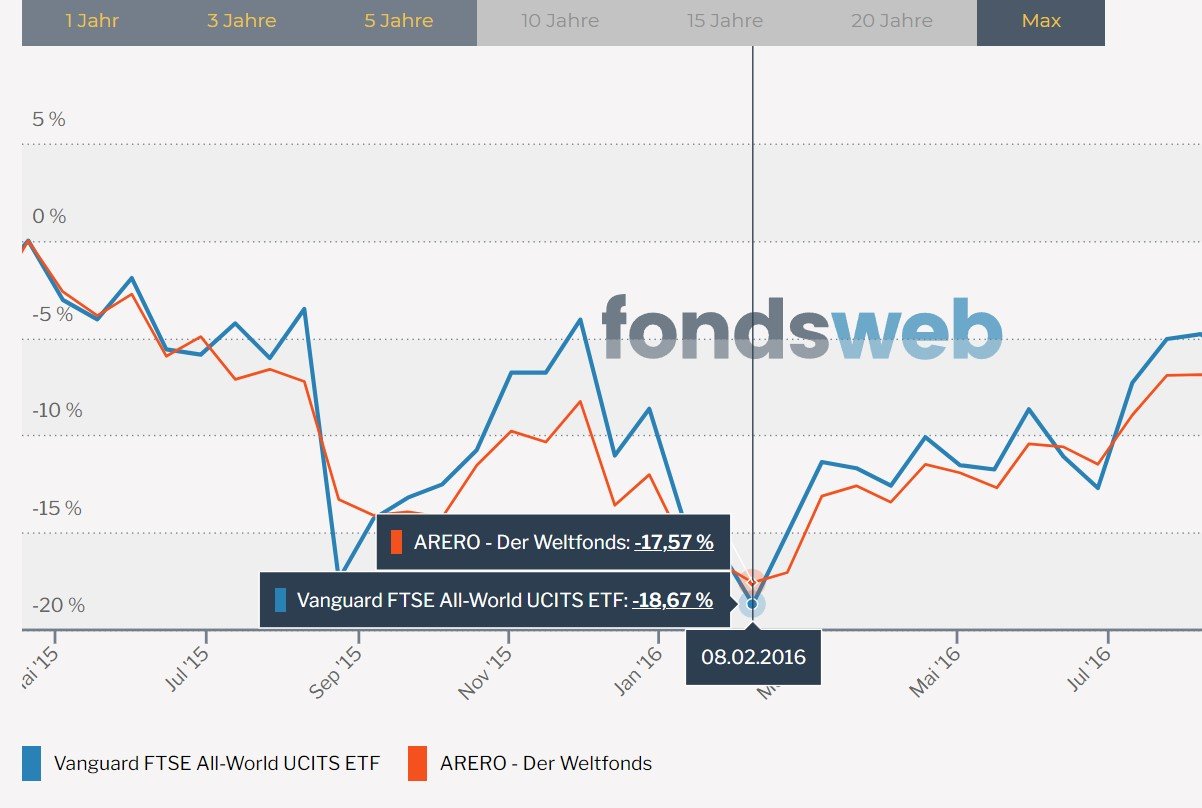 Madame_Q Oktober 28, 2021 Auf Wunsch eines Users habe ich den Arero Nachhaltig noch oben in die Tabelle aufgenommen. Auch hier noch ein paar Worte zum Arero Nachhaltig: 1. Der Anleihenteil ist identisch zum normalen Arero 2. Der Rohstoffteil ist der gleiche, nur ohne Agrar und Lebendvieh. Es wird dieser Index abgebildet: https://www.fondsweb.com/de/IE00BYQJ1388 3. Der Aktienteil wird durch einen DWS-eigenen ESG-Filter gejagt. Hier der Vergleich der beiden Arero-Varianten: https://www.fondsweb.com/de/vergleichen/ansicht/isins/LU0360863863,LU2114851830 Die laufenden Gesamtkosten des Arero Nachhaltig liegen leider mit 0,84% (noch) spürbar höher als bei der Standard-Variante (0,62%). Noch, weil die Mehrkosten durch hohe Transaktionskosten entstehen, die wiederum vermutlich durch das noch recht geringe Fondsvolumen entstehen. Genaueres hierzu findet man im Arero Thread ab hier: Diesen Beitrag teilen Link zum Beitrag