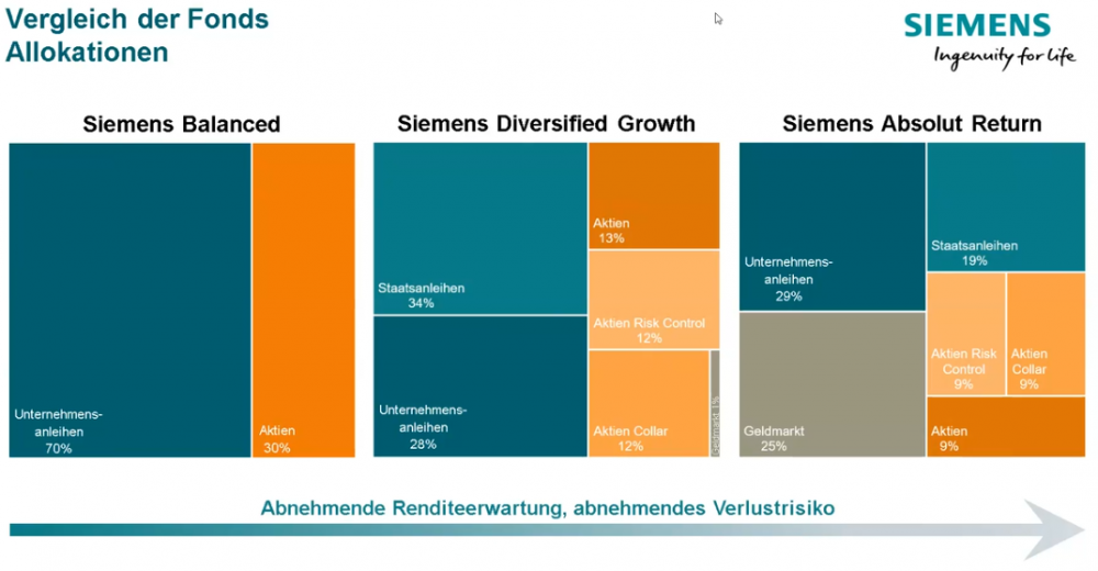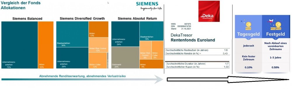 PeterS Dezember 3, 2021 · bearbeitet Dezember 3, 2021 von Madame_Q vor einer Stunde von stagflation: Absolut richtig, @Gene - das war schlampig formuliert. Ich habe es oben verbessert. Was empfiehlt man denen - zumindest für einen Teil ihres Anlagebetrags? Da gibt es in einer Siemens Mischfonds Präsentation ein schönes Bild, was deren Risiko-/Renditeerwartung aufzeigt. Je weiter rechts, desto rendite- und risikomindernd. Ich habe hier in einem anderen Thread mal den DekoTresor kennengelernt. Der könnte eventuell auch irgendwie als TG Ersatz gesehen werden mit wahrscheinlich einer Mindestlaufzeit von 2-3 Jahren: Was meint Ihr? https://www.deka.de/mms/DE0008474750.pdf Dazu bin ich auf die glorreiche Idee gekommen, meine MS Paint-Kenntnisse einzusetzen, und das Siemens-Bild etwas zu erweitern: Diesen Beitrag teilen Link zum Beitrag