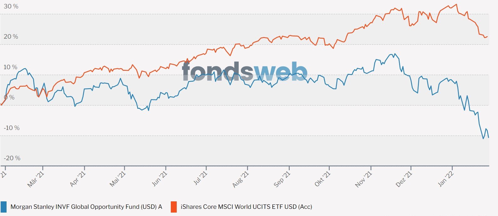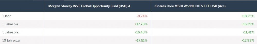 Barqu Januar 29, 2022 · bearbeitet April 28, 2022 von Madame_Q Am 29.1.2022 um 10:41 von Madame_Q: Anleger von Mischfonds erwarten sich gerade dort, dass der Fonds in turbulenten Zeiten auf irgendeine Weise besser "funktioniert" als ein reiner Aktienfonds oder sogar eine simple Mischung aus Tagesgeld und Aktienfonds. Mit welcher Berechtigung herrscht diese Erwartung? Weil teuer = besser? Am 29.1.2022 um 12:12 von Madame_Q: Der Morgan Stanley Global Opportunity war einer DER globalen Top-Aktienfonds, der die passiven Welt-ETFs massiv outperformed hat. https://www.fondsweb.com/de/vergleichen/ansicht/isins/LU0552385295,IE00B4L5Y983 Seit ca. einem Jahr sieht es aber leider so aus: Der Fonds hat ein sehr viel staerkeres IT Exposure als MSCI World und IT lief bekanntlich sehr gut. Nimmt man noch den NASDAQ mit in den Vergleich auf, wird es offensichtlich: Diesen Beitrag teilen Link zum Beitrag