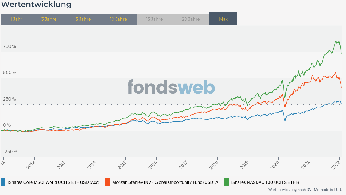 Madame_Q Januar 29, 2022 · bearbeitet April 28, 2022 von Madame_Q Am 29.1.2022 um 13:10 von Barqu: Der Fonds hat ein sehr viel staerkeres IT Exposure als MSCI World und IT lief bekanntlich sehr gut. Nimmt man noch den NASDAQ mit in den Vergleich auf, wird es offensichtlich: Ganz genau. Ergo war das Risiko des Morgan Stanley schon immer deutlich höher, als das eines Welt-ETF. Genau das ist ja der springende Punkt beim Vergleich aktiver Fonds mit Indexfonds. Trotzdem neigt man immer wieder dazu, zu ungenau simpel zu vergleichen. Hier hatten wir ja das Thema vor exakt einem Jahr: Diesen Beitrag teilen Link zum Beitrag