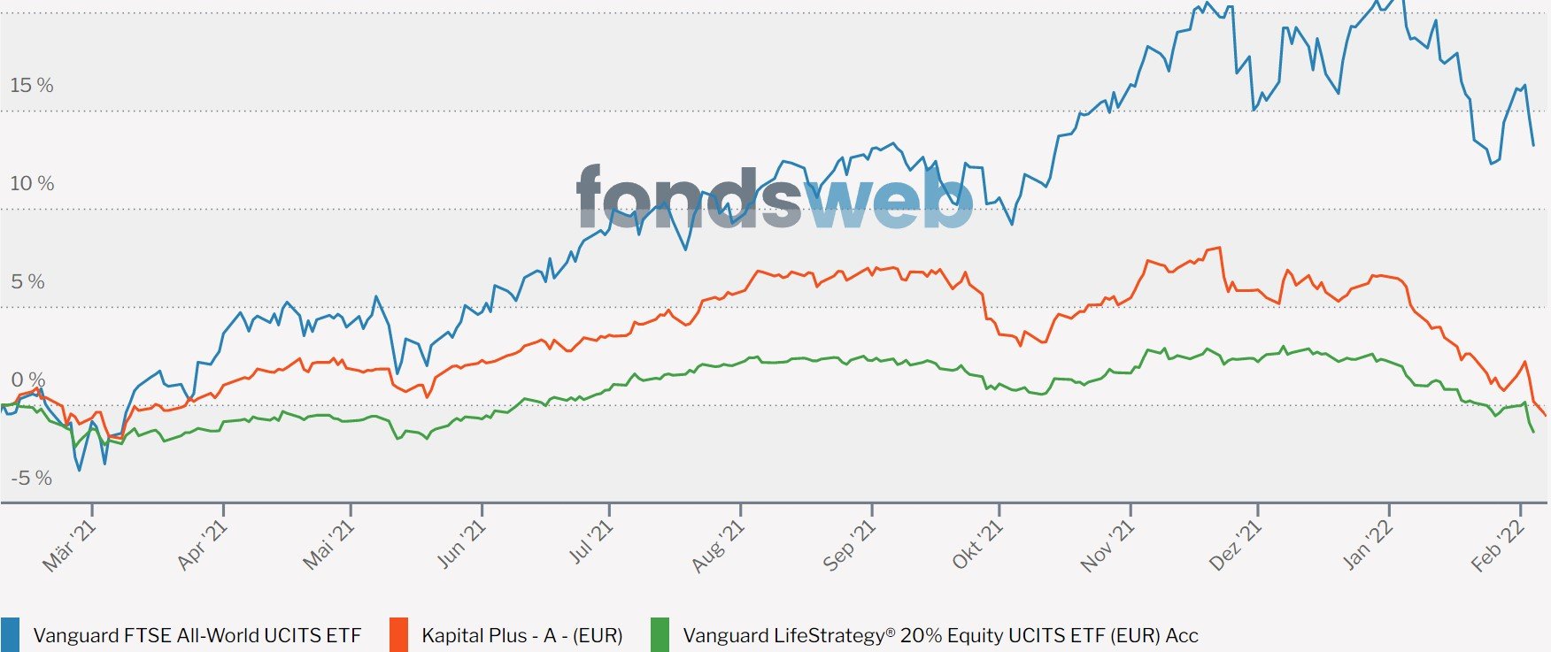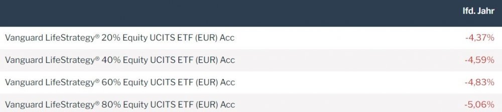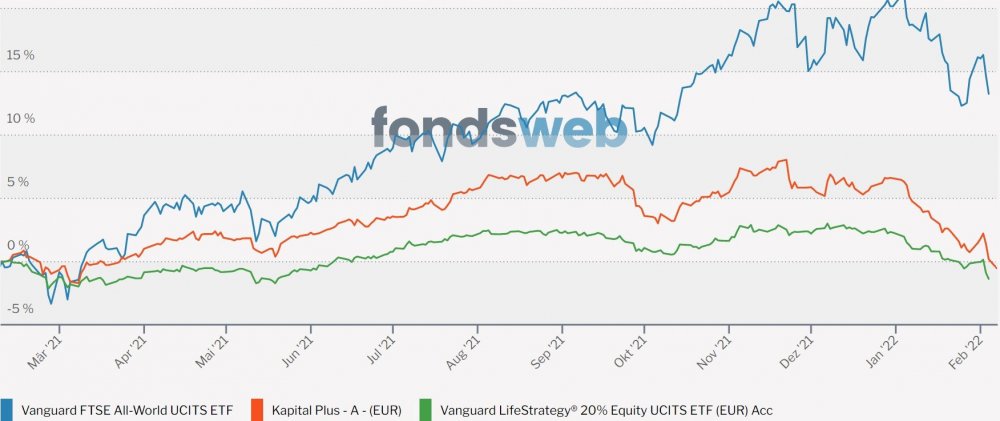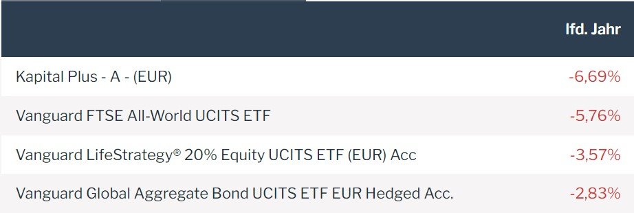 Madame_Q Februar 8, 2022 · bearbeitet Februar 8, 2022 von Madame_Q Es ist vollbracht. Der Kapital Plus hat nun tatsächlich das Kunststück geschafft, auf 1-Jahressicht eine negative Performance hinzulegen. Er und der (Überraschung!!)...Vanguard LS20...sind die einzigen Mischfonds hier, mit denen man im Minus wäre, wenn man vor einem Jahr gekauft hätte. Auffällig ist dies deshalb, weil beide Fonds sehr defensiv aufgestellt sind und weil in dieser Zeit weltweite Aktien ein Plus von knapp 15% hingelegt haben. Unlogisch ist es nicht, wenn man sieht, dass weltweite oder auch Euro-IG-Anleihen ein Minus von um die 5% fabriziert haben die letzten 12 Monate. Ob ein Anleger, der darin investiert hätte, das so erwartet hätte oder damit zufrieden wäre? Mehr als Tagesgeld mit 0% erwartet sich doch eigentlich jeder von irgendeinem Mischfonds in Zeiten, in denen die Börse gut läuft oder? https://www.fondsweb.com/de/vergleichen/ansicht/isins/IE00B3RBWM25,DE0008476250,IE00BMVB5K07 Auffällig auch die schlechte Performance in diesen wenigen Wochen des neuen Jahres: Übersetzung: Der Kapital Plus hat es geschafft, das Schlechteste aus beiden Welten (Aktien+Anleihen) zu addieren. Diesen Beitrag teilen Link zum Beitrag