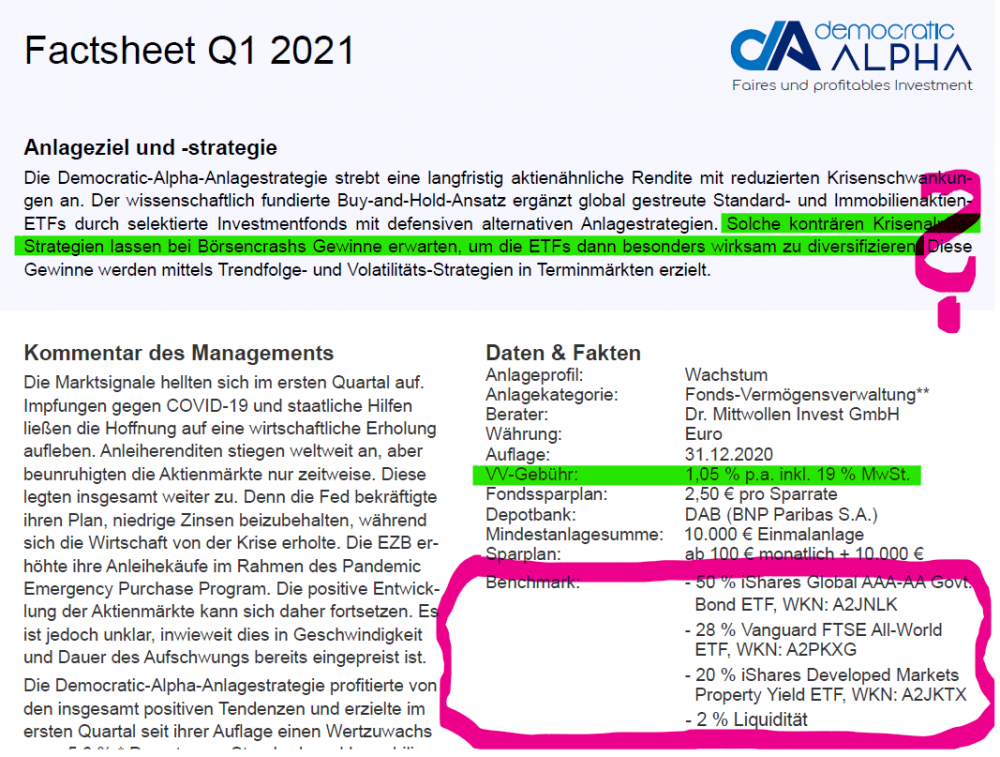 sedativ Juni 25, 2021 · bearbeitet Juni 25, 2021 von sedativ vor 34 Minuten von Saek: Es war hier doch schonmal Thema, was das nun für ein Konstrukt ist (ein Fonds ist es ja nicht). Das wird hier etwas beschrieben: https://www.democratic-alpha.com/vermoegensverwaltungsprozess/ Das sieht er selbst aber anders! https://www.democratic-alpha.com/warum-ich-bei-democratic-alpha-mitmache/ Das ganze Konstrukt ist ja noch krasser, als ich gedacht habe: Der Kunde - oder treffender: das Opfer - überlässt hier im "Idealfall" Warnecke & Mitwollen eine Vollmacht für sein gesamtes liquides Vermögen, die dann nach Gutdünken ETFs und "Alpha-Fonds" für 20€ pro Transaktion hin und her kaufen und verkaufen. Pro Jahr fließen dann noch 1,05% des Vermögens für diese Mühsal in die Taschen ebendieser Herren (edit: plus siehe oben @Bast ). "Finanzwesir - Für Leute, die ihr Geld selbst anlegen" Diesen Beitrag teilen Link zum Beitrag