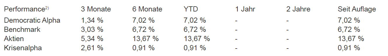 Rendito August 25, 2021 · bearbeitet August 25, 2021 von Rendito Democratic Alpha hat nun endlich das Factsheet zum 2. Quartal 2021 veröffentlicht. Daraus stammt folgender Ausschnitt: Machen wir zunächst den Prognose-Check: Am 21.7.2021 um 00:48 von Rendito: Meine Prognose für Democratic Alpha in Q2: ca. 2% Gesamtperformance damit deutlicher Rückgang gegenüber Q1 (5,6%) auch die selbstgesetzte Benchmark wird verfehlt das "Alpha-Zeugs" schreibt rote Zahlen Passt weitgehend - außer einer irritierenden Abweichung. Das Factsheet postuliert für das Krisenalpha in Q2 eine positive Performance von 2,61%. Eine kurze Überprüfung löst das Rätsel auf: im Factsheet wurde schlicht das Minuszeichen vergessen, in Tat und Wahrheit betrug die Performance -2,61%. Diesen Beitrag teilen Link zum Beitrag
