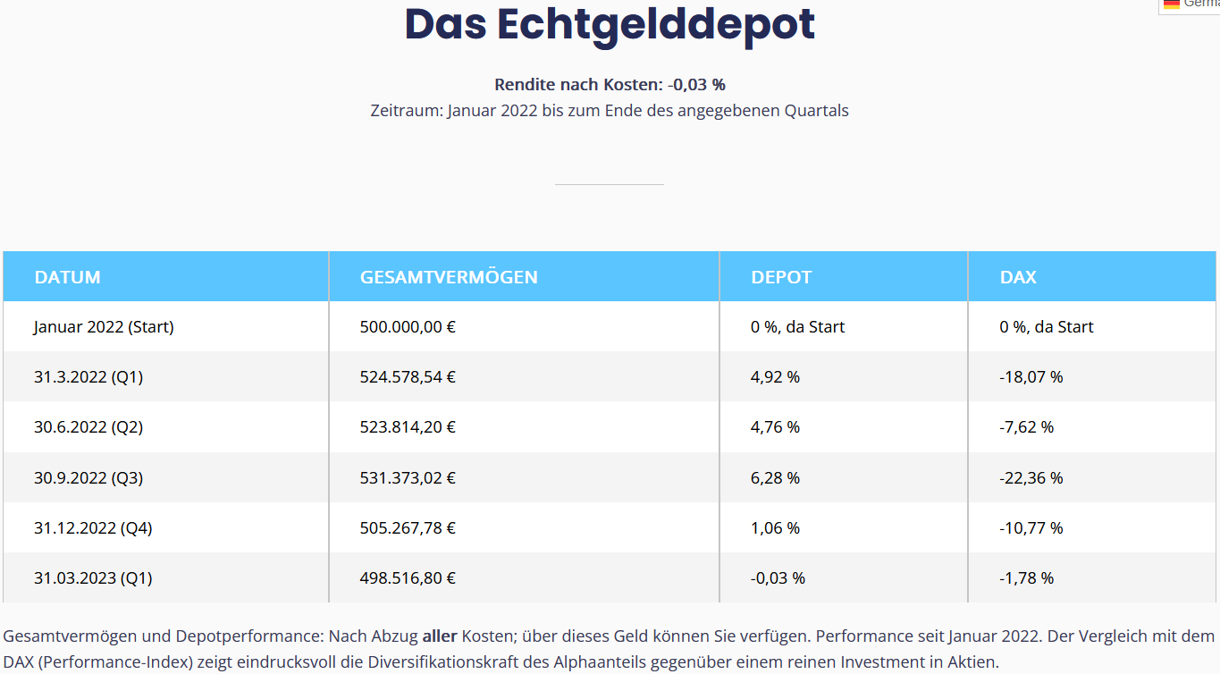 Theobuy Mai 27, 2023 vor 2 Stunden von Glory_Days: Angehängt der Echtgelddepotauszug (dieser listet nur die Kosten der DA-Vermögensverwaltung auf (angegebene Kosten von 4.126,38 EUR seit 21.01.2022 - was seltsam ist, da alleine die Verwaltungskosten laut Angabe auf der DA-Webseite 1,0115% (inkl. MwSt) betragen (und 1% von 500 TEUR bereits 5 TEUR sind); die zusätzlichen Kosten der verwendeten Produkte sind implizit im Kursverlauf enthalten): Da der Fonds sich positiv entwickelt hat in den meisten Quartalen müssten es sogar über €5.000 sein... Diesen Beitrag teilen Link zum Beitrag