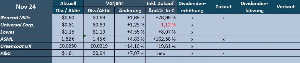 Die Dividendenerträge im November waren um 79,4% höher als im Vorjahr. (ca. 6,5 % stammen von Dividendenerhöhungen, der Rest von Zukäufen).