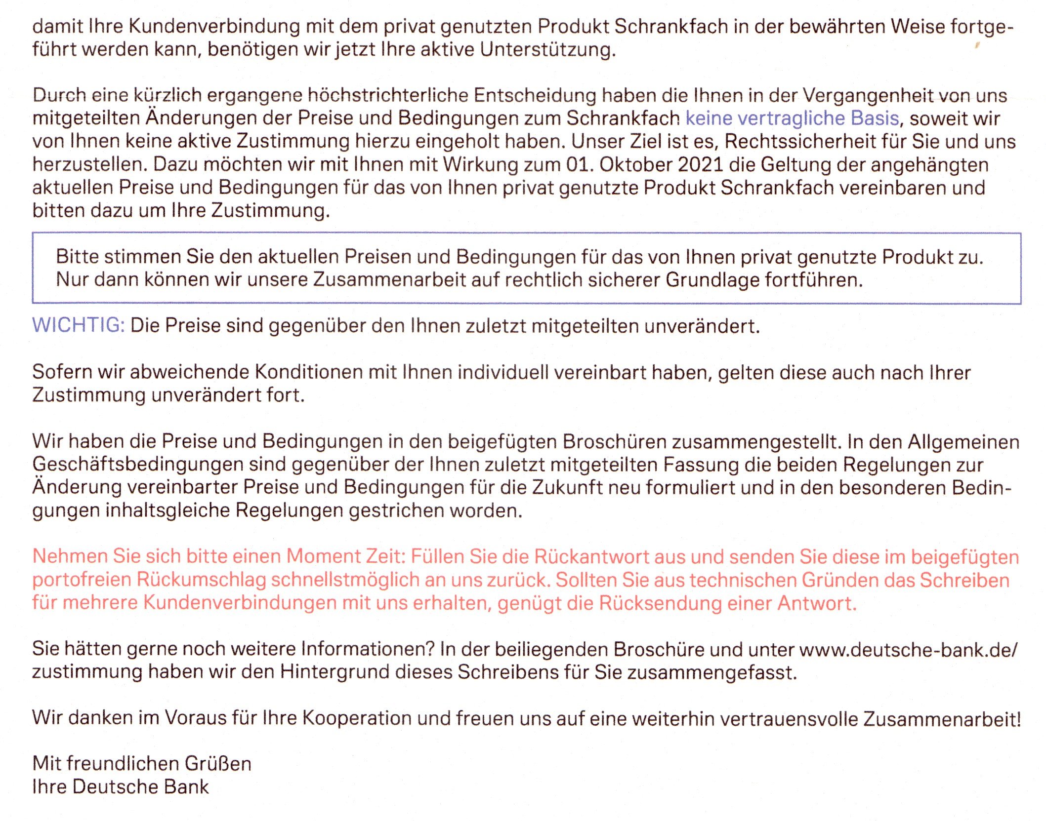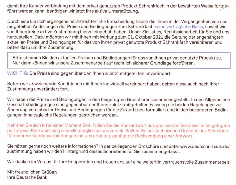 Ramstein Juli 17, 2021 · bearbeitet Juli 17, 2021 von Ramstein Gibt es wirklich noch keinen Faden zur Deutschen Bank? (Ich meine nicht maxblue, sondern DB allem ein.) Die Suche hat jedenfalls auf den ersten 20 Seiten nichts angezeigt. Beim Juni-Kontoauszug gab es eine Anlage: Zitat Sehr geehrte Kundin, sehr geehrter Kunde, die vorausgegangene Abrechnung steht hinsichtlich der Entgeltbelastung unter Vorbehalt. Es wird noch ausgewertet, inwieweit sich eine aktuelle Entscheidung des Bundesgerichtshofs auf diese Abrechnung auswirkt. Wegen der berechneten Entgelthöhen müssen Sie nicht widersprechen. Wir werden Ihnen nach der Auswertung erforderlichenfalls potentielle Differenzbeträge zu Ihren Gunsten erstatten. Wir bitten um Geduld und Ihr Verständnis, denn die Auswertung kann noch einige Zeit dauern. Mit freundlichen Grüßen Ihre Deutsche Bank Jetzt kam ein Brief mit dicken Anlagen; hier das Anschreiben: Wirklich raffiniert formuliert. Naive Leser könnten meinen, es gehe nur um das Schliessfach. Aber die Anlagen sind auch die AGB und Kosten zu den Konten. Man stimmt also auf dem beigefügten Antwortformular (mit Freiumschlag für die Rücksendung) auch den neuen Kontoführungsgebühren und sonstigen Dinge zu, die bisher wohl nicht gültig sind. (Noch ist keine deutliche Kündigungsdrohung bei Nichtzustimmung dabei.) Immerhin findet man unter dem angegeben Link, dass es um ALLE Preise und Bedingungen geht. Diesen Beitrag teilen Link zum Beitrag