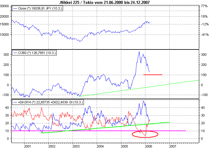 Aktiencrash Februar 3, 2006 Fazit:Kurzfristig sollte man abwarten und keine neuen Positionen aufbauen, bis sich eine Bodenformation gebildet hat. Kursziel weiterhin 16482 Punkte. Das Kursziel von 16482 wurde erreicht ! Das ging schneller als ich gedacht habe. Es wurde bereits ein neues Hoch generiert, wobei nun eine kleine horiz. Unterstützung bei ca. 15360 Punkte liegt. Der CCI schleicht weiterhin unter seine neg. Divergenz (rot) dahin. Ein Zeichen das die Konsolidierung noch nicht beendet ist. Die wichtigste horiz. Unterstützung liegt weiterhin bei 13106 Punkte. Fazit: Die Hausse im Nikkei 225 ist weiterhin intakt. Diesen Beitrag teilen Link zum Beitrag