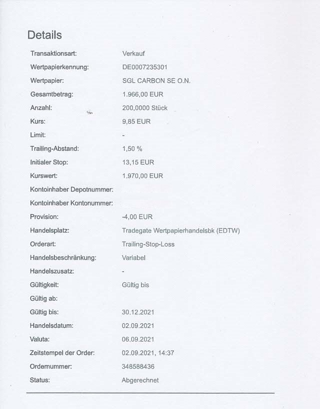bert-ICE September 7, 2021 · bearbeitet September 7, 2021 von Cai Shen pers. Daten vor 4 Stunden von Flaschenpfand: Du müsstest viel mehr Angaben machen Bert, damit wir das nachvolliziehen können: - In welcher Aktie wurdest du ausgestoppt? Oder war es ev. ein Optionschein (wegenen BNP Paribas)? - Gehandelt auf welchem Börsenplatz? - Genauer Zeitpunkt wo du den Trailing-Stop gesetzt hast? - Genauer Zeitpunkt zu dem du ausgestoppt wurdest? Bei einem Kursverlauf ohne jegliche Lücken/Gaps solltest du bei einem Kurs von mind. 13.55 - 2.5% augestoppt werden. Wenn es jedoch Kurslücken gibt, z.B. wenn der Kurs 25% tiefer eröffnet wird dein Stop getriggert und wie Undercover schrieb in eine Marketorder umgewandelt und dann zu einem deutlich tieferen Kurs bedient. Hallo Flaschenpfand, anbei den Verkauf Details. Obern die Angaben waren nur so als Beispiel von mir angegeben. Jetzt die Richtigen Daten zum Verkauf Trailing-Stop-Loss - Oder vom 02.09.2021 um 14 Uhr 37 das ist auch die Verkaufszeit die in der Wertpapierabrechnung steht. Diesen Beitrag teilen Link zum Beitrag
