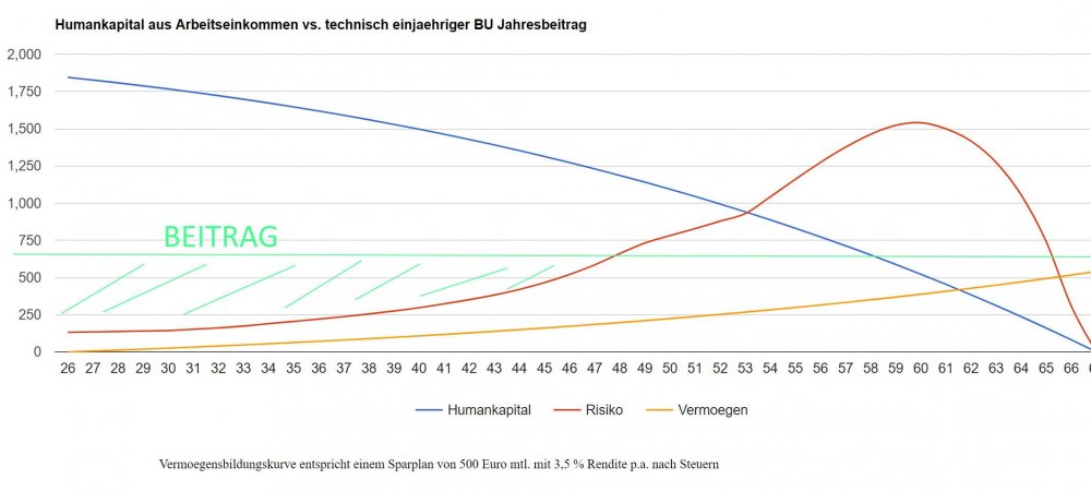 Mit einem Grundproblem. Nimm Jahr 66, steht bei 2000 Euro BU-Rente noch 24000 Euro Versicherungssumme aus. Logisch, dass die Prämie dafür "niedrig" ist. Ich selbst nehme technisch einjährig kalkulierte Beiträge als hilfsweise Darstellung. Aber die ganze Kurve muss eben nach links verschoben werden.