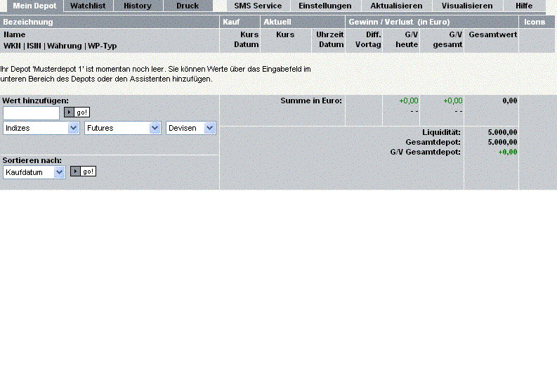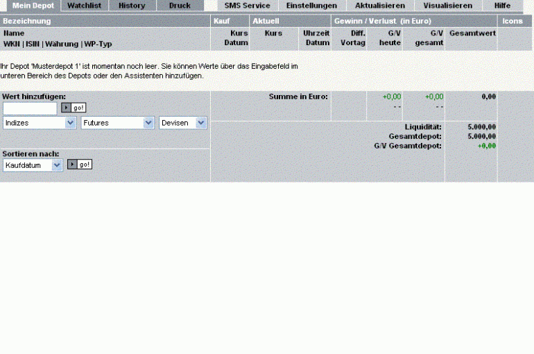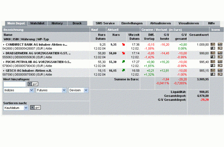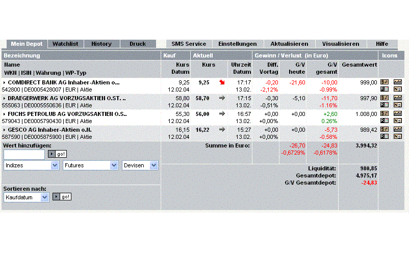 tron21 Februar 13, 2004 ich habe in den regeln für dieses depot festgehalten das es nur aktien sein dürfen die an deutschen indizes gelistet sind! also wenn du einen titel weißt den du mir vorschlagen willst dann bin ich gerne bereit mir dein angebot zu überlegen! zum zweiten punkt deiner frage. ich wollte die aktien so lange halten wie sie noch potenzial haben! oder ich kapital brauche um einen neuen titel mit mehr potenzial zu kaufen. eine frage habe ich aber noch: kann ich bei dab auch im musterdepot stopkurse setzen? diese funktion habe ich leider noch nicht beim dab musterdepot gefunden. anbei habe ich noch mal eine übersicht vom depot. hat sich nicht wirklich viel getan..... hoffen wir mal auf die nächste woche.....das da mehr passiert! B) Diesen Beitrag teilen Link zum Beitrag