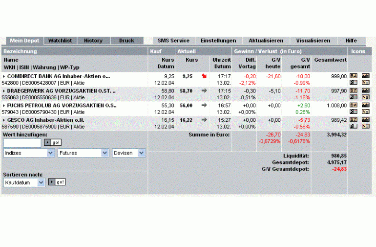 tron21 Februar 13, 2004 hier die aktuellen stopkurse: comdirect bank: 8,32 drägerwerk vz: 52,90 fuchs petrolub: 49,80 gesco: 14,55 Diesen Beitrag teilen Link zum Beitrag
