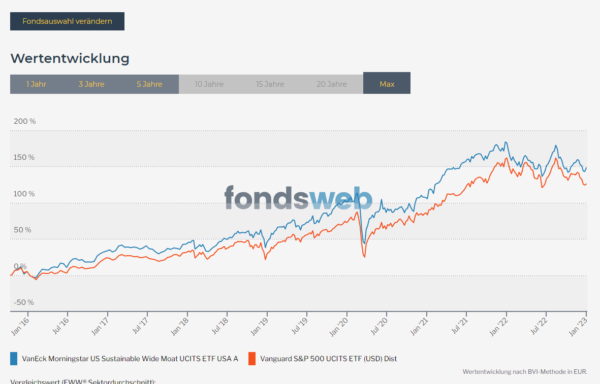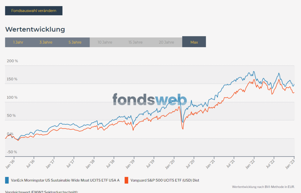 cutter111th Januar 9, 2023 vor 21 Stunden von Tom49: Wide Moat finde ich zwar interessant, aber mit Momentum hat das wohl nichts zu tun, oder? Ich dachte, wir seien hier auf der Suche nach der besten in Deutschland kaufbaren Momentum Strategie. Aber anyway, VanEck schreibt: Strategy based on a proven and transparent indexing model from Morningstar, the renowned research partner Companies with long-term competitive advantages for 20 years or longer (switching costs, intangible assets, network effect, cost advantage, efficient scale) Based on Warren Buffett´s “Economic Moats” concept Zum ersten bullet point: Ist das Indexing Model von Morningstar "proven", also sich als erfolgreich bewiesen? Die Performance in den letzten 12 Monaten und in den letzten 5 Jahren war identisch mit dem Vanguard S&P 500. Siehe Comdirect Charts unten. Zum zweiten bullet point: Nach Gefühl vom Manager? Zum dritten bullet point: Ich bin immer skeptisch, wenn ne Firme sich PR mäßig auf Buffett bezieht. Hat Buffett überhaupt ein "Konzept" mit genauen meßbaren Kriterien definiert? Bezweifle ich. Mir ist klar, dass es hier um den Momentum Faktor geht, aber darum ging es auch in deiner von mir beantworteten Frage nicht. Was die Performance betrifft, so recht der US Wide Moat Index bis ins Jahr 2006 zurück und hat den S&P seither deutlich geschlagen. Leider wurde der entsprechende ETF dazu aber auf einen ESG Index umgestellt. Seither lässt auch die Performance zu wünschen übrig. Den ETF gibt es auch schon deutlich länger als die globale Variante. Aber dafür gibt es hier einen eigenen Thread. Back to topic Diesen Beitrag teilen Link zum Beitrag