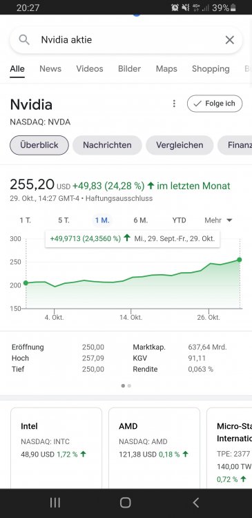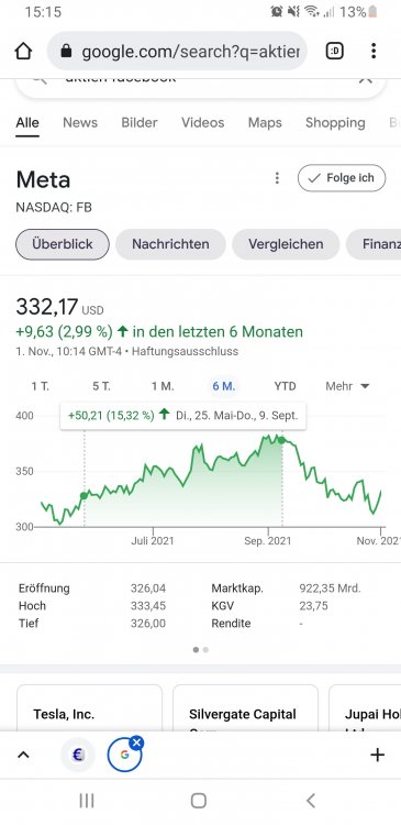 Raion969 November 1, 2021 Hallo Welche App könnt ihr mir empfehlen um eine gute Übersicht bei Aktien zu erlagen bzw um die neuesten infos usw zu bekommen. Derzeit suche ich eine App die wie auf der google hompage 2 zeilen mit % anzeigen grafisch darstellbar ist. Siehe foto Diesen Beitrag teilen Link zum Beitrag