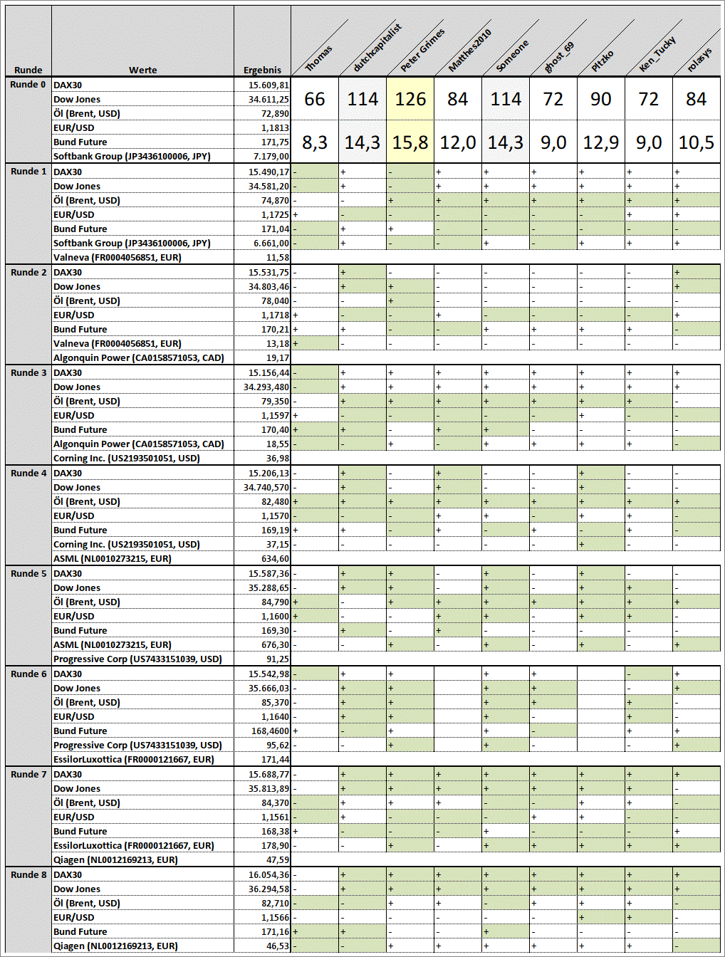 Neue Startwerte und Veränderung aus der letzten Runde: