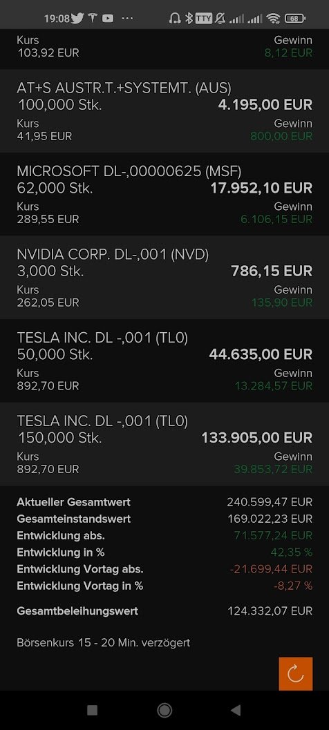 herbert_21 Mai 13, 2022 · bearbeitet Mai 13, 2022 von herbert_21 Eingang Dividende Apple 16,02€ Flatex sendet mir meine Steuerabrechnung. Letztes Jahr habe ich 24500an Gewinnen realisiert. Ich hatte das Luxusproblem, keine Position zu finden, welche im Minus war. Vielleicht in dem Zusammenhang interessant: Darstellung der Positionen in € am 23.11.2021 und Kurs von Tesla am selben Tag: + Frage an meine Kritiker: Wie haben sich die Kurse seither entwickelt? Adobe, Shopify, SoFi? Buy and Hold bis in den Tod? Die Gründe, warum ich meine Amazon Aktien verkauft habe, tun rückblickend nichts zur Sache. Hier mein Verkaufskurs: Sprich jede der sechs Amazon Aktien wäre jetzt 500€ im Minus. Es gibt nicht nur "entgangene Gewinne" (weil ich mein Alphabet und Berkshire zu früh verkauft habe) es gibt auch "nicht erlittene Verluste". Ein Freund von mir hat PayPal mit 65% Minus im Depot. Da würde ich beim Aufmachen des Brokers schon kotzen. 6M Kursverlauf Tesla in Euro (Tradegate) Gerade bemerkt: ich habe jetzt doppelt so viele Anteile im S&P 500 im Vergleich zum 23.11. Fazit: Das Ge-Trade mag alles viel zu viel Gebühren verschlingen*, aber mit der Mehrheit meiner Verkäufe bin ich rückblickend zufrieden. Diesen Beitrag teilen Link zum Beitrag