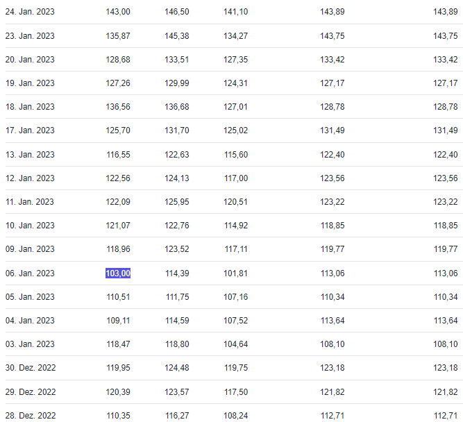 herbert_21 September 27, 2023 · bearbeitet September 27, 2023 von herbert_21 Am 6.1.2023 um 17:53 von Bigwigster: @herbert_21 mir ist klar, dass man so eine schmerzliche Achterbahnfahrt wie mit Tesla bzw. 2022 allg. erstmal verdauen muss, mich würde dennoch interessieren was für Schlüsse und Konsequenzen von dir daraus gezogen wurden/werden. (...) Ich freue mich übrigens für dich, dass deine Notbremsung bei Tesla nicht mit einem schmerzlichen Rebound der Aktie bestraft wurde. Der folgende Kursverlauf von Tesla sollte rational gesehen zwar keinerlei Erkenntnisgewinn bringen ob es richtig oder falsch war, mental macht es das Ganze aber mit Sicherheit leichter. Das ist wirklich nicht gut gealtert: Datum Open Hoch Tief Schlusskurs Berichtigter Kurs Heute 27.9.2023 YTD Diesen Beitrag teilen Link zum Beitrag