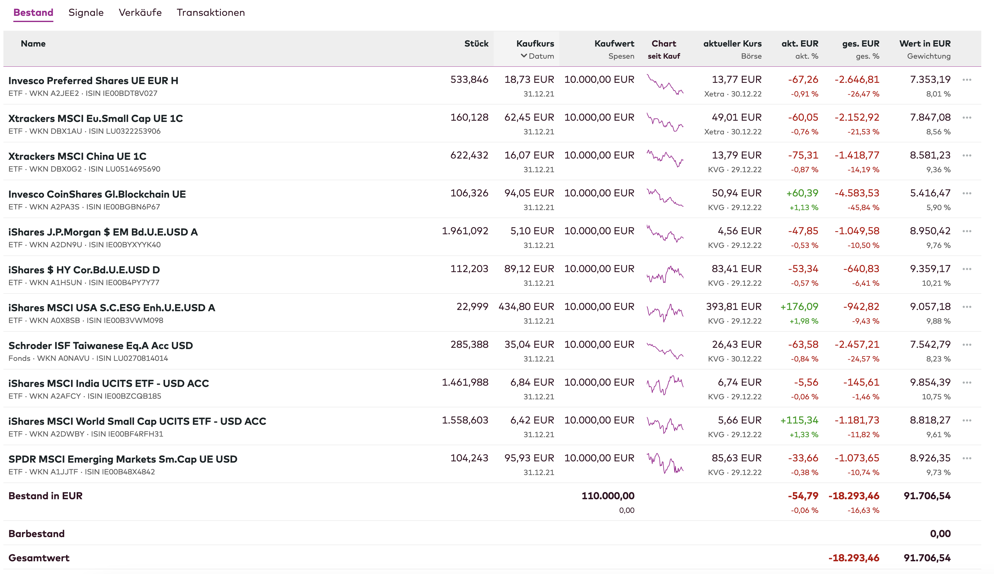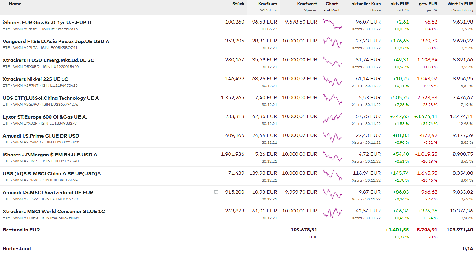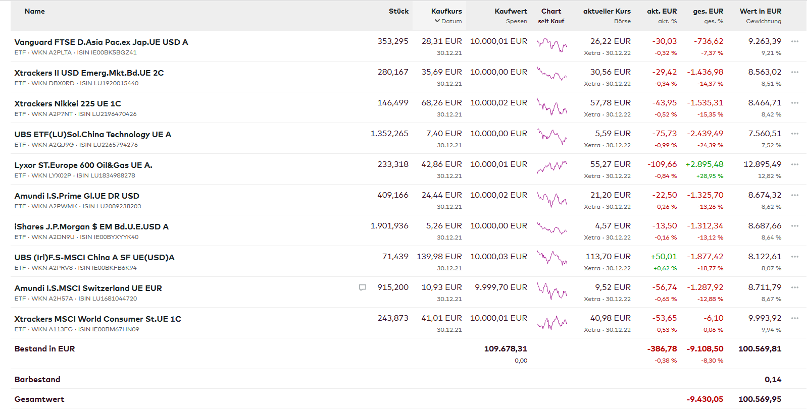 Schildkröte Dezember 31, 2022 Hallo allerseits, anbei meine Performance für 2022 (in Klammern jeweils): DE0008490962 DWS Deutschland - Aktienfonds Deutschland (-22,09%) LU0256839191 Allianz Europe Equity Growth - A - EUR - Aktienfonds Europa (-30,65%) IE00B5BMR087 iShares Core S&P 500 UCITS ETF (Acc) - Aktienfonds USA (-18,15%) IE00B53SZB19 iShares NASDAQ 100 UCITS ETF B - Techaktien USA (-32,60%) LU0048816135 Invesco Greater China Equity Fund A - Aktien China (-21,18%) DE0008475096 Allianz Rohstofffonds A Fonds - Minenaktien (+7,44%) IE00BYXG2H39 iShares Nasdaq US Biotechnology ETF - Biotech-Aktien USA (-10,82%) LU0158528447 Deka Wandelanleihen € (-13,22%) DE0008490988 Deutsche Global Hybrid Bond - € Hybridanleihen (-11,25%) LU0132385880 Fidelity Funds - US High Yield Fund A (EUR) - $ Hochzinsanleihen USA (-3,90%) LU0055649056 DWS Gold Plus - Rohstoffe/Devisen (+4,16%) Damit ergibt sich in der Summe eine finale Performance von -13,84%. Euch allen einen guten Rutsch und ein frohes gesundes neues Jahr! Diesen Beitrag teilen Link zum Beitrag