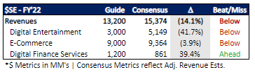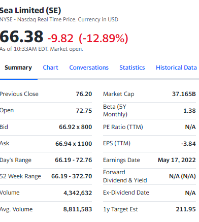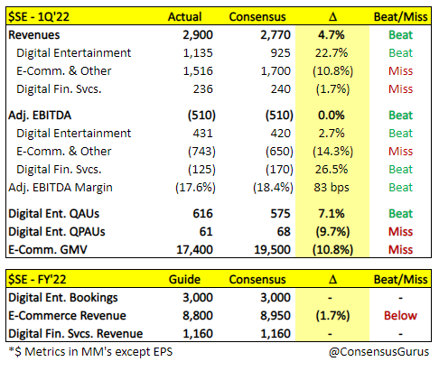 herbert_21 März 1, 2022 · bearbeitet März 1, 2022 von herbert_21 Es waren nicht die Ergebnisse, es war nicht das Marktumfeld, sondern die Guidance, die bei Sea Limited heute enttäuschte: Q4 '21 Ergebnisse Zitat Revenue +105.7%YOY Digital entertainment Revenue +104.1%YOY QAUs 654m (+7.1%YOY) Paying users 77.2m (+5.6%YOY) E-commerce Revenue +89.4%YOY Gross orders +90.1%YOY GMV+52.7%YOY Fintech Revenue +711%YOY FY '22 revenue guidance ~+32%YOY Man gibt die das Shopee Pilotprojekt in EU auf und zieht sich aus Frankreich zurück. Nachfolgend die Tabelle mit den Erwartungen, zunächst für die Guidance (blau) und wie üblich in gelb die Consensus Estimates für einzelne Bereiche - die Zahlen kameb heute aus US-Sicht vorbörslich: Diesen Beitrag teilen Link zum Beitrag