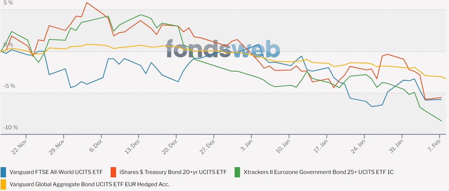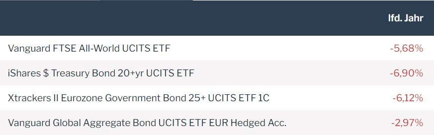 Madame_Q Februar 9, 2022 · bearbeitet Februar 11, 2022 von Madame_Q Wie sich Zinsängste auswirken können auf die beiden Assetklassen Aktien und Anleihen, haben die letzten Wochen recht gut gezeigt: https://www.fondsweb.com/de/vergleichen/tabelle/isins/IE00B3RBWM25,IE00BSKRJZ44,LU0290357846,IE00BG47KH54 Recht gut zu erkennen ist, dass die Anleihen in der Korrektur Ende Nov 2021 noch relativ gut negativ mit den Aktien korrelierten. Ab dem Jahreswechsel, als es mit den Aktien bergab ging, war es dann vorbei damit und alle Anleihen gingen gemeinsam mit abwärts. Was dagegen den Rückgang von Aktien und Anleihen in den letzten Wochen gut abgefangen hätte, wären Rohstoff-Futures gewesen: https://www.fondsweb.com/de/vergleichen/tabelle/isins/IE00B3RBWM25,IE00B4WPHX27,IE00BSKRJZ44,LU0290357846,LU0419741177 Aber: Man sieht auch, dass die Rohstoffe Ende November zusammen mit den Aktien massiv/sogar noch stärker eingebrochen sind. Das ganze Spielchen ist und bleibt also ein bisschen ein Überraschungsei. Also am besten gar keine anderen, riskanten Assets außer Aktien halten (weil eh nichts wirklich sicher "funktioniert") oder alles nehmen nach dem Motto "irgendeine andere Assetklasse wird schon funktionieren"? Diesen Beitrag teilen Link zum Beitrag