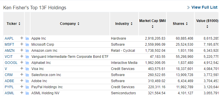 herbert_21 Dezember 10, 2021 · bearbeitet Dezember 10, 2021 von herbert_21 Bei Gurufocus findet man die größten Holdings von Ken Fisher: Man kann daraus jetzt entweder schließen, dass Tech 2021 gut gelaufen ist, oder aber, dass Tech auf Grund geringer Verschuldung, hoher Margen und Preisssetzungsmacht durch Burggräben auch 2022 gut überstehen wird. Ich bin ein Anhänger der zweiten These. Diesen Beitrag teilen Link zum Beitrag