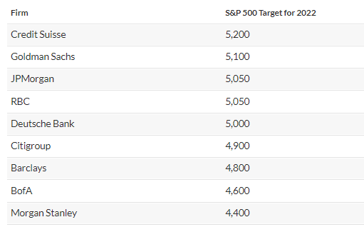 herbert_21 Dezember 9, 2021 · bearbeitet Dezember 9, 2021 von herbert_21 RBC dazu Most of the equity upside should be realized between now” and the first half of 2022, “when monetary and fiscal policy tailwinds will be strongest,” JPMorgan Chase & Co. strategists said in a 2022 outlook report Wednesday. Credit Suisse analysts said in a Dec. 8 research report that they raised their S&P 500 price target to 5,200 from 5,000, partly because of projections for “robust” economic growth. Goldman expects the U.S. stock benchmark will end 2022 at 5,100, according to a portfolio strategy research report from the bank dated Dec. 3. Goldman Sachs expects the S&P 500 will end 2022 at 5,100, according to a portfolio strategy research report from the bank dated Dec. 3. Meanwhile, JPMorgan analysts predicted in a research report at the end of November that the U.S. stock benchmark will rise next year to 5,050, partly on “robust earnings growth” and easing supply chain woes. RBC Capital Markets has forecast the same price target as JPMorgan, while Deutsche Bank predicts the S&P 500 will end next year at 5,000, according to a slide presentation from its chief investment office. Meanwhile, Citigroup set an S&P 500 target of 4,900 for the end of 2022, a research report from the bank in late October shows. Coming in below that level, Barclays predicted in a U.S. equity strategy report this month that the index will finish next year at 4,800. “Proceed with caution,” the Barclays analysts wrote in their 2022 outlook report dated Dec. 2. “We see limited upside for equities next year,” they said. In their view, “household and corporate cash hoards should support modest earnings growth but persistent supply chain woes, reversal of goods consumption to trend and China hard-landing are key tail risks.” Bank of America’s analysts have a lower price target than Barclays for the S&P 500 next year, with a BofA Global Research report last month showing the benchmark will end 2022 at 4,600. “Unfortunately we see a lot of similarities between today and 2000 — the tech bubble peak,” said Savita Subramanian, head of equity and quant strategy at BofA, during a late November media briefing on their U.S. stock market outlook. Morgan Stanley has a more bearish outlook for next year that puts the S&P 500 below the index’s close Tuesday at 4,686.75. A report Monday from the bank’s wealth management division shows a base-case forecast of 4,400 for the S&P 500 at the end of 2022 even with an expected gain in earnings. “We expect the S&P 500 to be range-bound and volatile, and bond returns to be negative net of inflation,” said Lisa Shalett, chief investment officer at Morgan Stanley Wealth Management, in the note. “Fixed income should be reduced to fund greater exposure to real assets and to absolute return funds.” The core of Morgan Stanley’s “cautious” view on the S&P 500 is based on price-to-earnings ratios typically compressing during “a midcycle transition,” Shalett said. She pointed to a chart in her note showing that “median stock has traversed the midcycle transition.” | Quelle: Market Extra: Proceed with caution’: here’s what Wall Street analysts see for the U.S. stock market in 2022 (8. Dez 2021) Siehe auch: JPMorgan’s S&P 500 forecast for 2022 is among the most bullish on Wall Street. Here’s the biggest risk it sees for stocks. 30. November 2021 As for stocks and sectors, the bank likes long equity exposure to rising oil prices (the bank predicts oil prices will hit $150 by 2023), financials, consumer services, healthcare and small-caps. The travel, leisure and experiences theme has “extremely attractive risk-reward, while momentum is “again getting increasingly correlated and crowded with growth stocks,” the bank cautioned. Hier noch die Prognose von RBC Capital “From a U.S. equity market perspective, the main risk we see today is that the intermediate-term bout of leadership in value, cyclicals, and small cap we’ve been waiting for may be on hold,” analysts led by Lori Calvasina, RBC’s head of U.S. equity strategy, said in a note Monday. “These parts of the U.S. equity market have been deeply undervalued and tend to outperform when U.S. GDP is running hot,” and ahead of first rate increases by the Federal Reserve, they said. RBC is for now keeping its S&P 500 price target of 5,050 for 2022, according to the note. The analysts said that the S&P 500 index, which tracks the performance of U.S. large-cap stocks, has “a clear secular growth bias” that aids its resilience during times of investor nervousness. Within equities, the relative performance of growth versus value, secular and cyclical, and large-cap and small-cap, “have all been moving in sync with trends in domestic COVID-19 cases for most of 2021,” according to the RBC report. “When the rate of change in domestic COVID-19 is worsening,” the analysts said that “growth, secular, and large cap have tended to outperform.” Diesen Beitrag teilen Link zum Beitrag