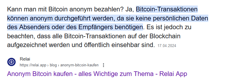 Wenn man pseudonym meint könnte man es schreiben. Und gerade der Relai-Text windet sich m. E. aalartig um die klare Aussage herum. Ist aber egal, das "Narrativ" der anonymen BTC-Zahlung ist größtenteils eh gegessen. Ob allerdings Leute die sich in Grundzügen damit befassen ausreichen um genug Geld in den BTC zu bringen?