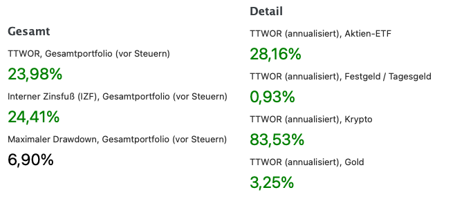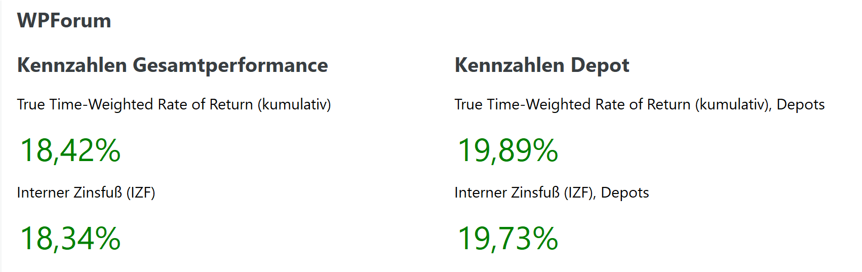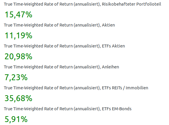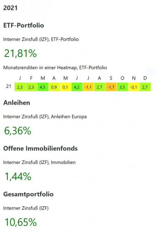 wilmergasse Januar 1, 2022 · bearbeitet Januar 1, 2022 von wilmergasse Depot-Zusammensetzung (ca. im Jahresdurchschnitt) 20 % risikoarmer Teil 80 % Aktien (davon 95 % ETF, 5 % Einzelaktien) Mit Excel berechneter interner Zinsfuß (nach Steuern und Handelskosten): Gesamtportfolio: +16,19 % Aktienanteil: + 20,46 % Diesen Beitrag teilen Link zum Beitrag