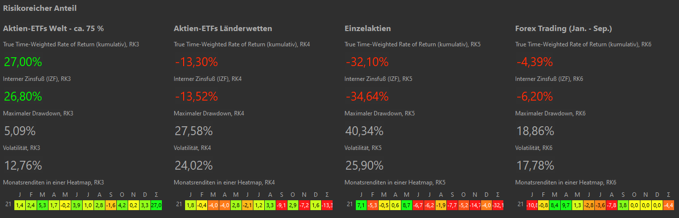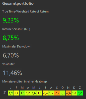 IRRer-Zins Januar 2, 2022 Performance 2021 16,7% IRR / TWROR nach Kosten und (latenten) Steuern Auf Monatsbasis: Vola 6,1% MaxDD 1,7% Asset Allokation: 62% Bankprodukte 62% Aktien 6% Cash 5% Anleihen, Rohstoffe, sonstiges -35% Fremdkapital Diesen Beitrag teilen Link zum Beitrag