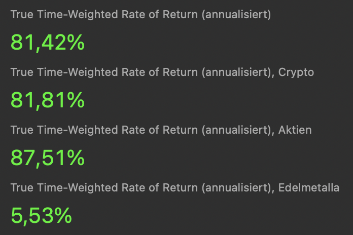 The Statistician Januar 1, 2022 31.12.2020 bis 31.12.2021 PP: nominale Veränderung von 31.12.20 - 31.12.21 (Einzahlungen, Kurserfolge, Erträge...): +131k Aktien wurde maßgeblich durch GameStop "verzerrt", ansonsten nur langweilige ETFs inkl. Faktoren. Bitcoin und Ethereum haben die Performance natürlich noch einmal aufgrund der ordentlichen Gewichtung ins Positive "verzerrt". So ein Jahr wird es denke ich bei mir nicht noch einmal geben, gab da so einige glückliche Zufälle. Derzeitige Gewichtung zwecks Einordnung: ~55% Aktien ~31% Crypto ~14% Edelmetalle ...wird mittelfristig verstärkt in Aktien umgeschichtet. Diesen Beitrag teilen Link zum Beitrag