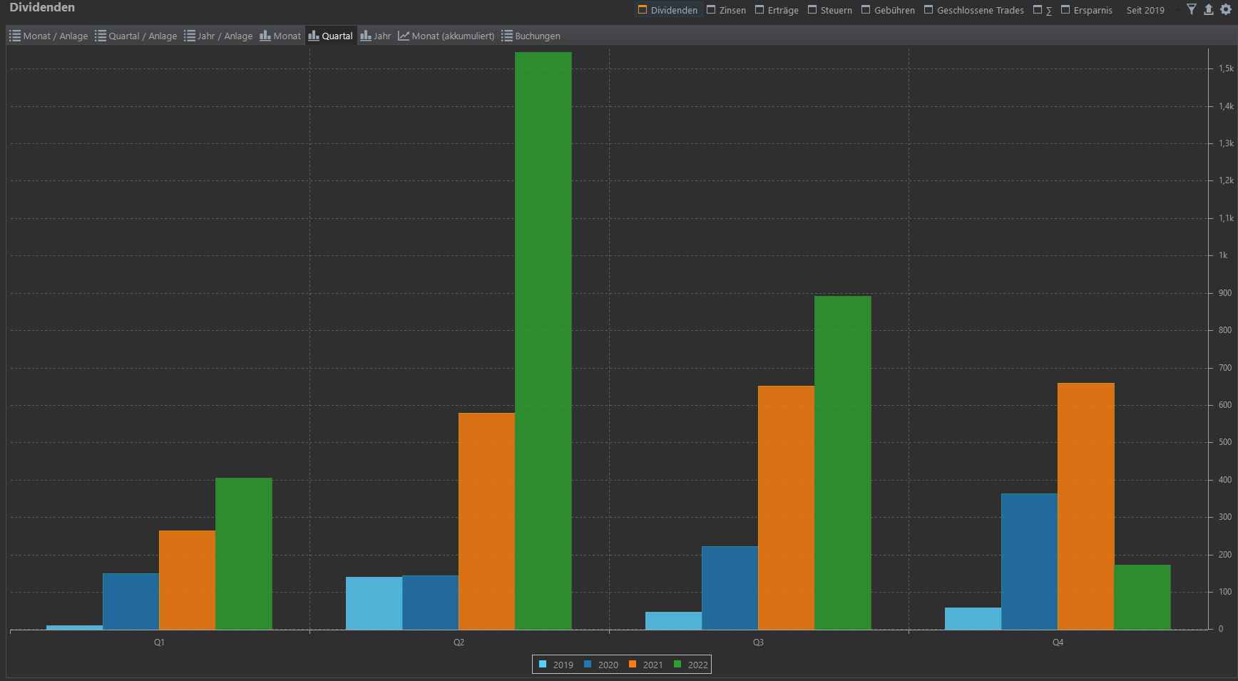 Bezüglich Dividenden gab es länger kein Update, das hole ich nun mit einer Grafik für die Monate & Quartale nach. Viele Einmalzahler haben letztes Jahr aufgrund Corona später als üblich gezahlt, deshalb bin ich teilweise unter Vorjahresniveau - bei den starken Monaten April bis Juli voll OK.