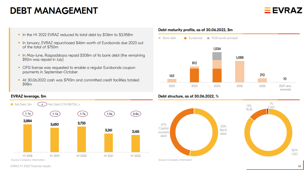 reko August 10, 2022 · bearbeitet August 10, 2022 von reko @Funkadelic Ich bin auch nur Laie, aber mM ist hier (abgesehen von den Kosten einer Papierauslieferung) nichts neues zu dem was wir vor 3 Wochen bereits diskutiert haben. Alternativ zur Papierauslieferung ist die Verwahrung der Aktien bei Evraz, falls man nichts tut. EVRAZ_H1_2022_financial_results_presentation_.pdf Zitat Update on current situation ▪ EVRAZ is below best practice and is at minimum legal requirements in terms of governance as the Board includes only CEO and CFO ▪ Sanctioned status poses significant hurdle to re-establish a Board that should be majority independent ▪ Currently, EVRAZ has no sponsor/corporate broker ▪ Ernst & Young does no longer work with EVRAZ. The review of H1 2022 financial results was provided by TSATR – Audit Services LLC formerly known as EY Russia and lately re-branded to B1 Group ▪ Computershare Investor Services notified EVRAZ of termination of registry and associated services on 19 August 2022 +31% YOY Umsatz +19% YOY EBITDA FCF minimal negativ (-59 M$) 2022+2023 müssen 163+812 M$ Schulden zurückgezahlt werden, Cashbestand 793M$ Diesen Beitrag teilen Link zum Beitrag