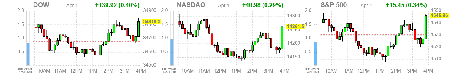 Nachdem zu Quartalsende gut gehende Aktien abgestoßen wurden, was besonders auf dem Nasdaq lastete, scheinen jetzt institutionelle Investoren weiterhin long zu gehen - zu erkennen an den grünen Balken kurz vor Handelsende in allen drei US Indizes.