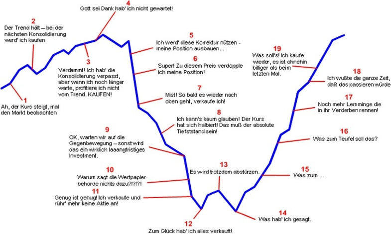 Rein rational ist es zwar völliger Blödsinn, aber wer erst verkauft hat, der hat natürlich die Historie seines Investments im Kopf und kann jetzt nicht teurer einkaufen als man erst kurz vorher verkauft hat. Das fühlt sich nämlich wie ein doppelter Verlust an. Diese blöde Schranke im Kopf führt dazu, dass rationales Handeln erschwert wird.