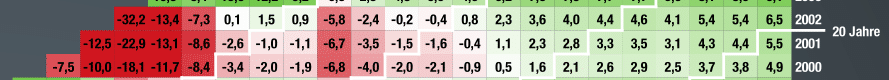 Sapine August 30, 2022 vor einer Stunde von Saek: Das 'Problem' bei dieser Grafik ist die Annualisierung der Renditen. Ohne werden die Ausschläge vermutlich immer heftiger, je länger die Anlagedauer wird. Zunächst ist es erst mal eine andere Darstellung. Die Erkenntnis, dass ich mit meinem Spartrieb womöglich 2 Mio zusammen bekomme, hilft mir wenig weiter. Für mich als Sparer ist wichtig, welches Ergebnis ich erwarten kann und wo ich sozusagen eine untere Abschätzung habe. Die kann ich mit der annualisierten Realrendite deutlich besser abschätzen als mit Ergebnisspannen, bei denen ich nicht weiß mit welcher Wahrscheinlichkeit sie eintreten werden. Man kann genau ablesen, dass bei einer Anlagedauer von 20 Jahren es in den letzten 150 Jahren mit all seinen Weltkriegen und Katastrophen keinen einzigen Zeitraum mit einer negativen Realrendite gab. Was man aber auch erkennen kann sind die Zusammenhänge zwischen der Bewertung der Aktienmärkte und der Renditeentwicklung. Das Gedächtnis bei den Renditen sozusagen und eben kein reiner Random Walk. Phasen schlechter Renditen bewirken Bewertungsänderungen der Märkte und in der Folge kommen nach den mageren die fetten Jahre. Wie viele und wie fett kann natürlich keiner vorhersagen. Diesen Beitrag teilen Link zum Beitrag