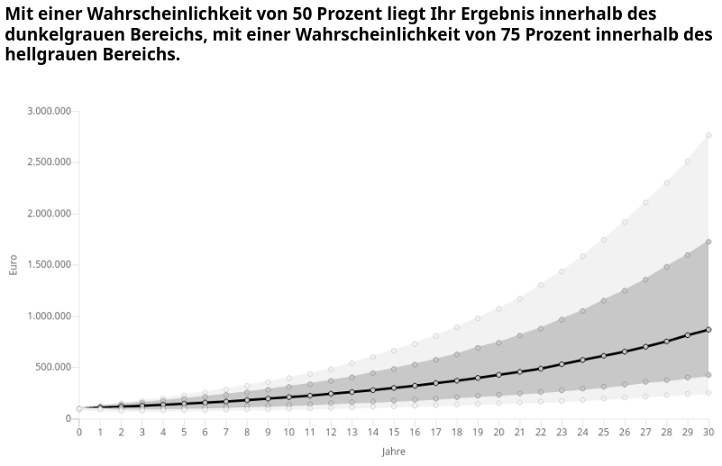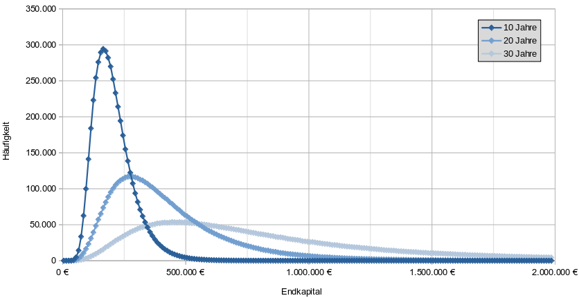 stagflation August 30, 2022 · bearbeitet August 31, 2022 von stagflation Am 29.8.2022 um 15:03 von vanity: Da stagflation gerade so in Fahrt ist: Ich wünsche mir das Diagramm bei fester Renditeerwartung/Vola (am besten vielleicht für den blauen Fall 80/20), unterschiedlichen Anlagezeiträumen (z. B. 15, 20, 25, 30 Jahre) um zu sehen, ob die Zeit alle Wunden heilt. Hier die Ergebnisse... Startkapital: 100 k€ Keine Sparraten Berechnetes Portfolio: 80/20 Erwartete Rendite: 7.5 % Volatilität: 12% Anlagedauer: 10 Jahre, 20 Jahre, 30 Jahre Erwartetes Endkapital: 206 k€, 425 k€, 875 k€ Die Häufigkeitsverteilung wird mit längerer Anlagedauer immer breiter. Etwas ähnliches kann man auch beim Entnahmerechner des BVI sehen. Wenn man dort 100 k€ anlegt und ähnliche Parameter wählt (keine Entnahmen, 100 % Aktien, Kosten: 0,5%, keine Steuern), bekommt man das gleiche Ergebnis: Auch hier wird die Verteilung immer breiter. Die Zeit heilt also keine Wunden, sondern das Ergebnis wird mit steigender Anlagedauer immer ungewisser. Diesen Beitrag teilen Link zum Beitrag