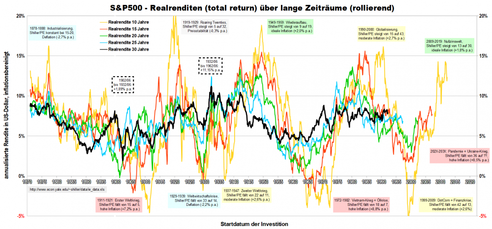 Gast231208 August 30, 2022 · bearbeitet August 30, 2022 von pillendreher vor 2 Stunden von Sapine: Die folgende Grafik zeigt die Realrenditen des S&P seit 1870 für die Anlagedauer von 10/15/20/25/30 Jahre. Wie zu erwarten sind die Ausschläge nach oben und unten umso heftiger desto kürzer die Anlagedauer ist. Danke @Sapine für diese Grafik: Was nehme ich mit? Über 10-15-20 Jahre war mit einer Investition in den S&P kein Blumentopf zu gewinnen, zumindest in gewissen Marktphasen. Blöd wenn diese Marktphase genau dann beginnt, wenn ich gezwungen bin, langfristig Geld aus meinem Aktiendepot zu entnehmen. Genauso blöd schon in der Ansparphase, weil es sein kann, dass jeder mit 50 Jahren investierte Euro in den Aktienmarkt, erst wieder mit 70 Jahren bei Plus-Minus-Null steht. Für mich ein sehr gutes Argument nicht nur auf Aktien in meinem Depot zu setzen. Danke nochmals für die Bestätigung, dass Diversifizierung über verschiedene Assetklassen Sinn macht. Diesen Beitrag teilen Link zum Beitrag