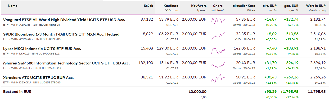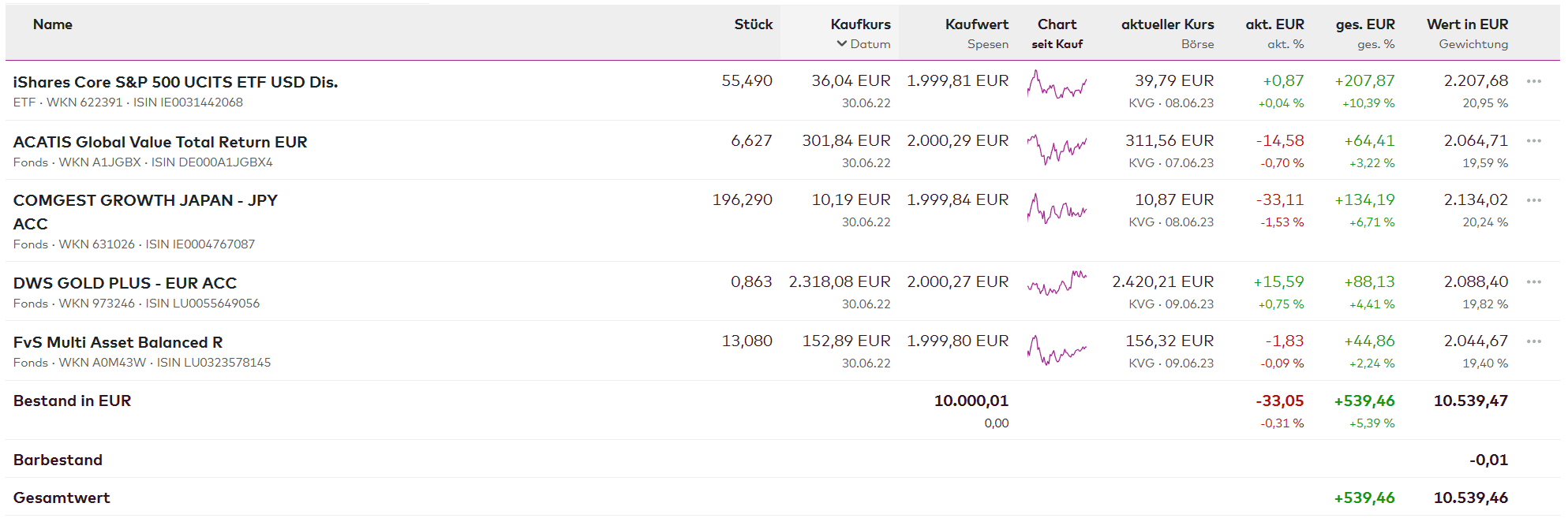 Mein Ergebnis ist 9,75%. Kurze Erklärung: Zur Kontrolle habe ich alle Werte nochmal mit KVG-Einstandkurs 30.06.22 anstatt 01.07.22 eingegeben- sind aber die gleichen Ergebnisse und Kurse. Irgendwie hatte es meine Kurse damals auf 01.07. gesetzt. Zusätzlich hatte ich ein Problem mit der Onvista-KVG-Kursstellung vom JP Morgan Fonds. Er stand ewig auf dem Kurs vom 29.06. und ist heute Nacht auf den Kurs vom 03.07. umgesprungen. Also war Rechnerei angesagt. Der NAV laut JP Morgan-Homepage war am 30.06.2023 21,09 Euro. Anteile X 21,09 ergibt 1976,58 Euro plus die vier anderen Endsummen ergibt 10975,37. Macht 9,75%- hoffe, das stimmt. Man möge nachrechnen.