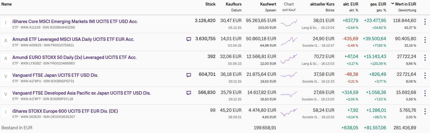 hattifnatt vor 3 Stunden Hier schonmal der Jahresupdate für 2025 Im Jahr 2025 wurden ca. 33k investiert, der Depotwert liegt aktuell bei 282k, es fehlen also noch ca. 118k zum Ziel von 400k (≈ 3½ Jahre Einzahlungen bei einer Annahme von Nullrenditen ). Zur Realisierung von Gewinnen für die NV-Bescheinigung wurden kürzlich 18k vom Amumbo in die Pazifik-Region umgeschichtet (und dabei leicht über-balanciert), sodass der Pazifik-Anteil jetzt schon der Ziel-Allokation entspricht. Die Aufteilung der Regionen und Hebel sieht aktuell so aus, mit einem aktuellen Hebel von 1,42: Mit diesen aktuellen ETFs: Möglicherweise werden wir das aktuell noch übergewichtete Europa durch einen Verkauf des iShares STOXX Europe 600 reduzieren, was auch den netten Nebeneffekt hätte, dass der Europa-Hebel auf 2 steigen würde. Noch einige Grafiken zur Entwicklung des Depots, wo man schön den Trump-Handelskrieg-Einbruch im Frühjahr sieht: ... und im Vergleich zu den Benchmarks 70/30 (entspricht ungefähr der Allokation) und iShares MSCI ACWI (A1JMDF): Allen ein gutes 2026! Diesen Beitrag teilen Link zum Beitrag