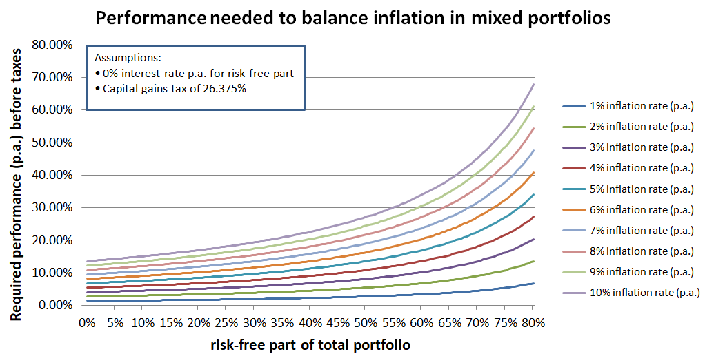 Glory_Days Juli 14, 2022 · bearbeitet Juli 14, 2022 von Glory_Days Ich hatte hier mal grafisch dargestellt, welche Rendite vor Steuern in einem gemischten Portfolio (risikobehaftet/risikofrei) notwendig ist, um alleine verschiedene Inflationsraten nach Steuern auszugleichen (= realer Werterhalt): Kosten könnte man hier noch on-top oben drauf rechnen, sind in den Produkten aber typischerweise bereits verrechnet. Die meisten Deutschen sind rendite-technisch langfristig zu risikoarm investiert - aber die risikoreiche Anlage funktioniert kurz- und mittelfristig eben nicht mit (positiven) geometrischen Durchschnittswerten. Diesen Beitrag teilen Link zum Beitrag