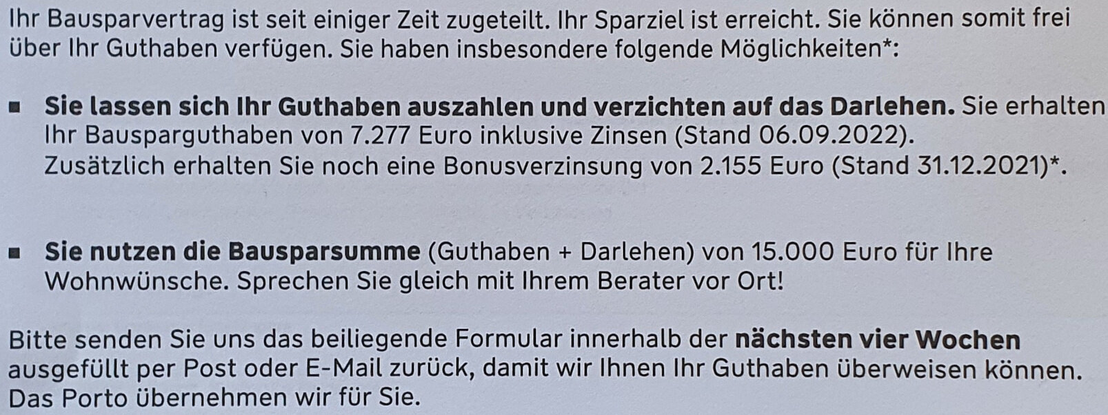 Die letzten Jahre kommen immer wieder Angebote, dass man sich das Sparguthaben + Bonus auszahlen lassen kann. Das wäre momentan 7.277€ plus 2.155€ Bonusverzinsung.