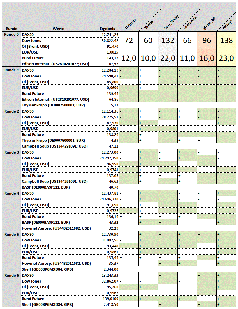 Thomas Oktober 28, 2022 Hallo zusammen, eine weitere Börsenwettrunde beginnt. Viel Spaß beim Wetten. Tippabgabe bis Montag 17:00 Uhr --> 7. Runde von 11 Runden. Neue Startwerte und Veränderung aus der letzten Runde: 1. DAX30: 13243,33 (+) 2. Dow Jones: 32862,07 (+) 3. Öl (Brent, USD): 95,26 (+) 4. EUR/USD: 0,9962 (+) 5. Bund Future: 139,01 (+) 6. Shell (GB00BP6MXD84; GPB): 2418,5 (+) 6. (Neu) Uniper (DE000UNSE018; EUR): 3,168 Informationen: Erst Tippabgabe! Danach können weitere Beiträge verfasst werden. Anders herum wird disqualifiziert! Die ersten 5 Werte stehen während der ganzen Tippsaison fest. Der 6. Wert wechselt von Runde zu Runde. Vorschläge für einen 6. Wert werden jederzeit entgegengenommen. Es dürfen jederzeit auch neue Spieler einsteigen und sich am laufenden Spiel beteiligen. Regeln: https://www.wertpapier-forum.de/topic/368-regeln-und-informationen-für-die-börsenwette/ Fragen: https://www.wertpapier-forum.de/topic/1420-fragen-zur-börsenwette-hier-rein/ Bitte die Tipps im vorgegebenen Format abgeben! So sieht der richtige Code als Beispiel aus: [hide ] (hier das Leerzeichen noch entfernen vor "]") 1. + 2. - 3. - 4. + 5. + 6. - [/hide] Mein Tipp: Versteckter Inhalt Du kannst den versteckten Inhalt sehen, sobald du auf dieses Thema antwortest. Diesen Beitrag teilen Link zum Beitrag
