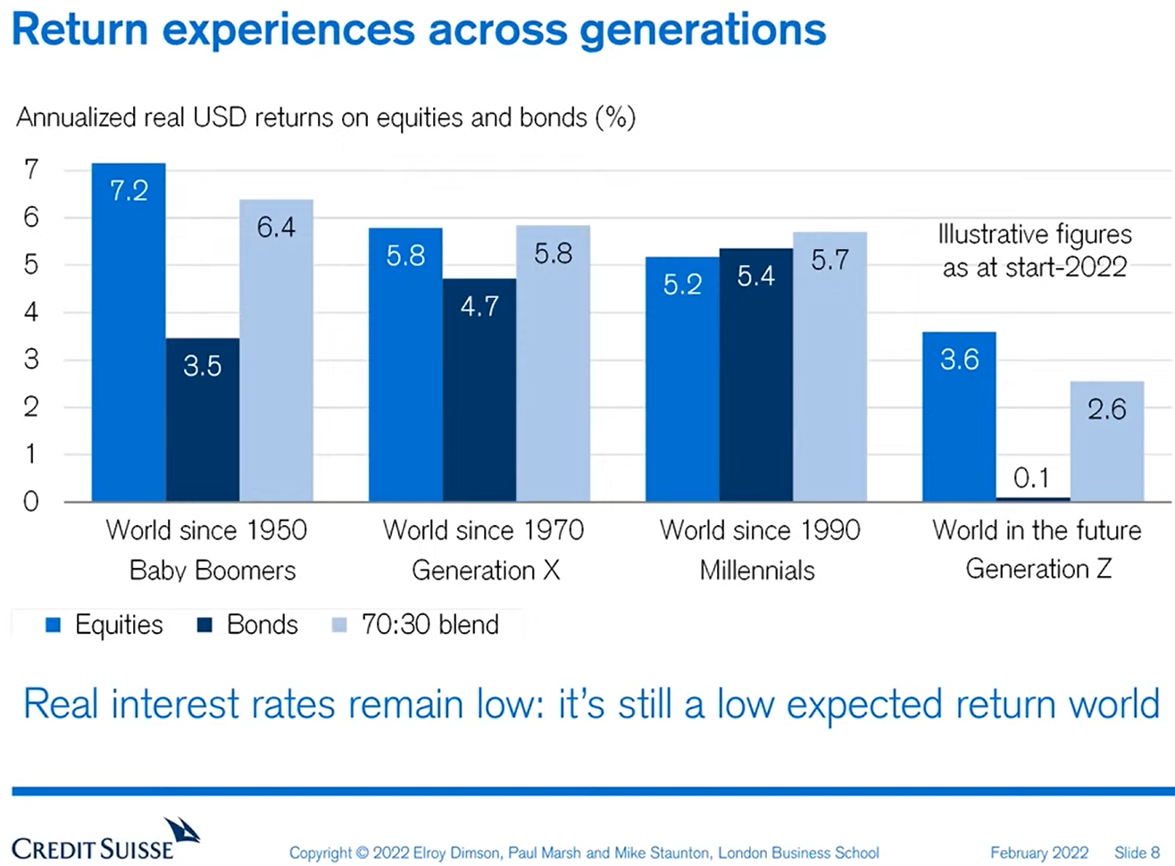 Glory_Days Juli 3, 2023 · bearbeitet Juli 3, 2023 von Glory_Days vor 9 Stunden von DST: Es ist nun noch nicht mal 1 Jahr vergangen und die Zinsen könnten schon bald bei 4% stehen. Gehst du noch immer von geringeren Renditen aus? Und wie hoch ist die heutige reale Rendite z.B. von 10-jährigen inflationsindexierten Bundesanleihen? Unabhängig davon ging es oben um reale Renditen über den Zeitraum von Generationen. Ein höherer heutiger Realzins sorgt tatsächlich für höhere zukünftige reale Renditen. Daher sind Einschätzungen die zukünftige reale Rendite betreffen - ungeachtet dessen, dass sie grundsätzlich sehr schwer vorhersehbar sind - stark zeitabhängig. Am 31.5.2023 um 18:14 von Glory_Days: The first thing to say about prospective returns is that you can think of returns as the real interest rate plus a premium for risk. That applies to any asset class you'd like to mention. [...] If you start from a low real interest rate you'd expect low subsequent [real] returns and if you start from a high real interest rate you'd expect high subsequent real returns - whether you're looking at bonds or equities. Real interest rates therefore provide the baseline for all risky assets. So when we're thinking about what future returns might be, we need to think about what the real interest rate is today. — Prof. Paul Marsh Am 2.6.2023 um 23:56 von Glory_Days: What can Generation Z the next generation expect? These are just illustrative figures at the start of 2023. But we think that 4% from equities is reasonable. We're taking current linkers inflation-protected bonds as a baseline here to get an idea of what the real rate of interest will be over this next generation and we're adding to that 3.5% equitiy risk premium. So Generation Z can expect almost the same equity returns as millenials but nothing like the Baby Boomers got but the bond return is likely to be much lower in the future than it was for those previous generations. And the 60/40 blend is also likely to be much lower in the future. — Prof. Paul Marsh Dieser Umstand wird sodann auch in der Abschätzung der zukünftigen generationalen Realrendite entsprechend berücksichtigt - was man durch einen Vergleich der 2022er und der 2023er Zahlen sieht (das Zeitfenster für Rendite-Projektionen wie unten dargestellt für die Generation Z hat in 2023 einen anderen Startpunkt als in 2022 und wird um ein Jahr kürzer kürzer (wenn das Zeitfenster konstant gehalten wird) - rückblickend müssen natürlich tatsächlich realisierte reale Renditen betrachtet werden, in die das schlechte Jahr 2022 dann einen entsprechend negativen Einfluss hat): Zahlen zu Beginn von 2022: Zahlen zu Beginn von 2023: Die Zahlen der anderen Generationen verringern sich, weil es sich hierbei um die tatsächlich realisierten realen Renditen dieser Generationen handeln sollte (Endpunkt in 2022 bzw. 2023) und nicht wie bei Generation Z um eine Projektion der zukünftigen Renditen ausgehend vom jeweils aktuellen Jahr (2022 bzw. 2023). Auf die realisierten Renditen hatten die 2022er realen Renditen einen stark negativen Einfluss, während auf die zukünftigen Renditen die 2022er realen Renditen einen stark positiven Einfluss hatten. Diesen Beitrag teilen Link zum Beitrag