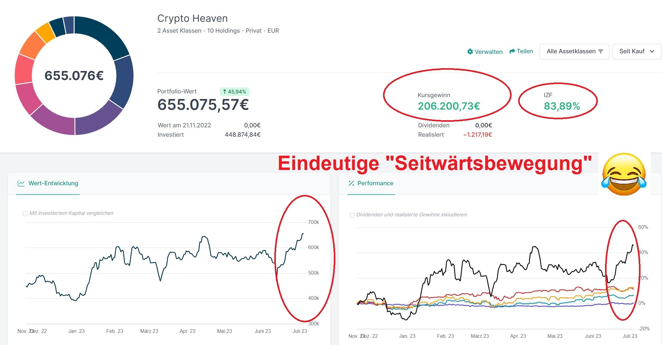 tradefrog Juli 4, 2023 lieber erbe: eigentlich war die seitwärtsbewegung bei bitcoin gemeint, aber auch deine 40% plus, sind nicht die welt über 6 monate, vor allem, weil das so bleiben wird aufgrund, der marktoszilliereung.. dein "verdienst war, daß du glücklich am boden der range (oder fast, da du am anfang kurz verluste hattest, wenn wir nicht irren) eingestiegen bist... da du aber kein swingtrader bist, nützt dir das nichts... Diesen Beitrag teilen Link zum Beitrag